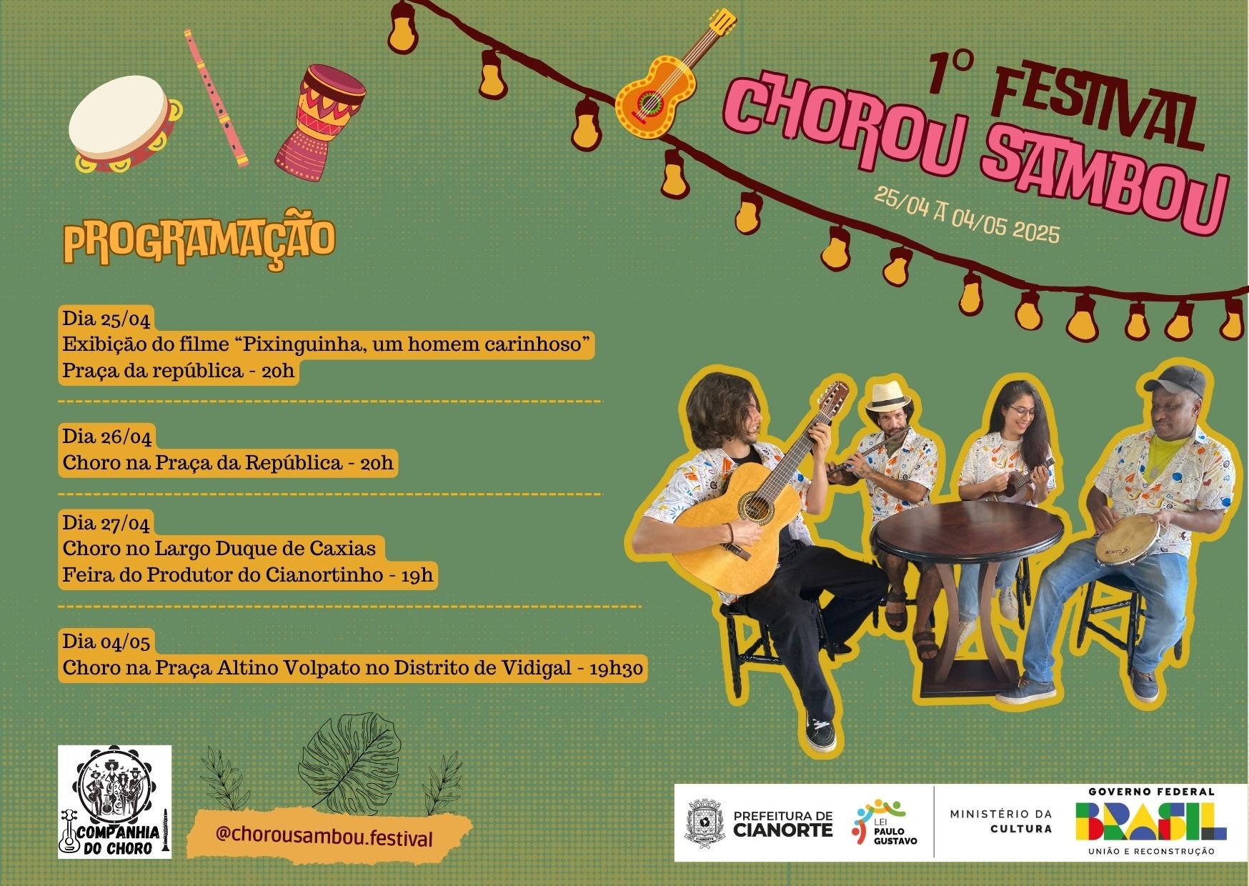 Cianorte será palco, a partir desta sexta-feira (25), até o dia 04 de maio, da primeira edição do vibrante "Festival Chorou Sambou". O evento, que promete agitar a cena cultural local, oferecerá muita música, com apresentações de choro em diferentes pontos da cidade, e exibição de filme temático.
