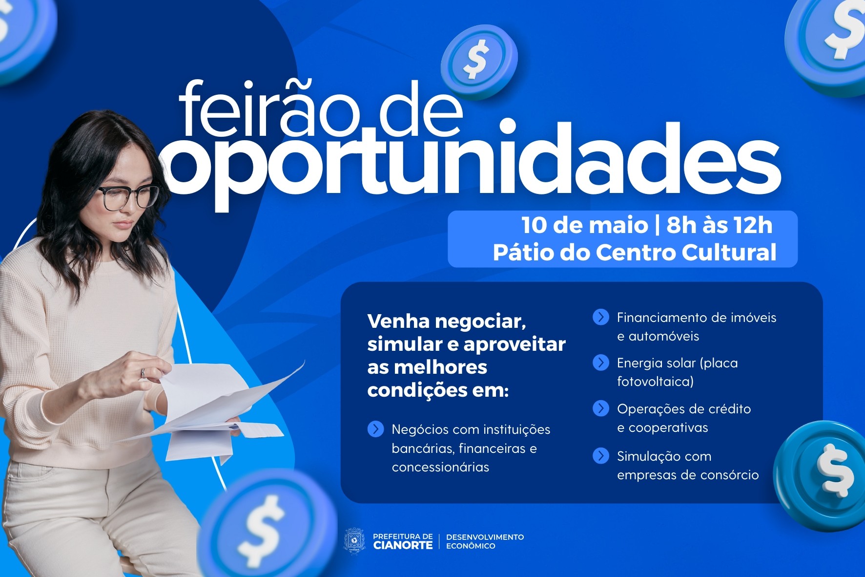 Quem busca realizar sonhos e fechar bons negócios terá uma ótima oportunidade durante o Feirão de Oportunidades. O evento, organizado pela Prefeitura de Cianorte, por meio da Secretaria Municipal de Desenvolvimento Econômico, será no dia 10 de maio, das 8h às 12h, no pátio do Centro Cultural (Av. América).