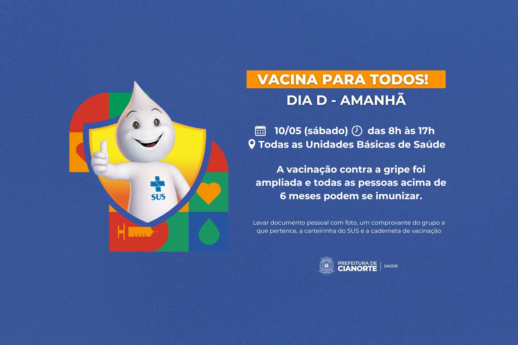 Neste sábado (10), a Secretaria Municipal de Saúde de Cianorte realizará o "Dia D" de vacinação contra a gripe. A iniciativa, que antes era destinada aos grupos prioritários, foi ampliada a toda a população com idade superior a 6 meses. A mobilização acontecerá em todas as Unidades Básicas de Saúde (UBS) do município, das 8h às 17h, sem pausa para o almoço. Para se vacinar, é imprescindível a apresentação de um documento pessoal com foto, um comprovante da sua condição (carteirinha do SUS, carteira de vacinação, declaração médica, etc.) e a caderneta de vacinação.