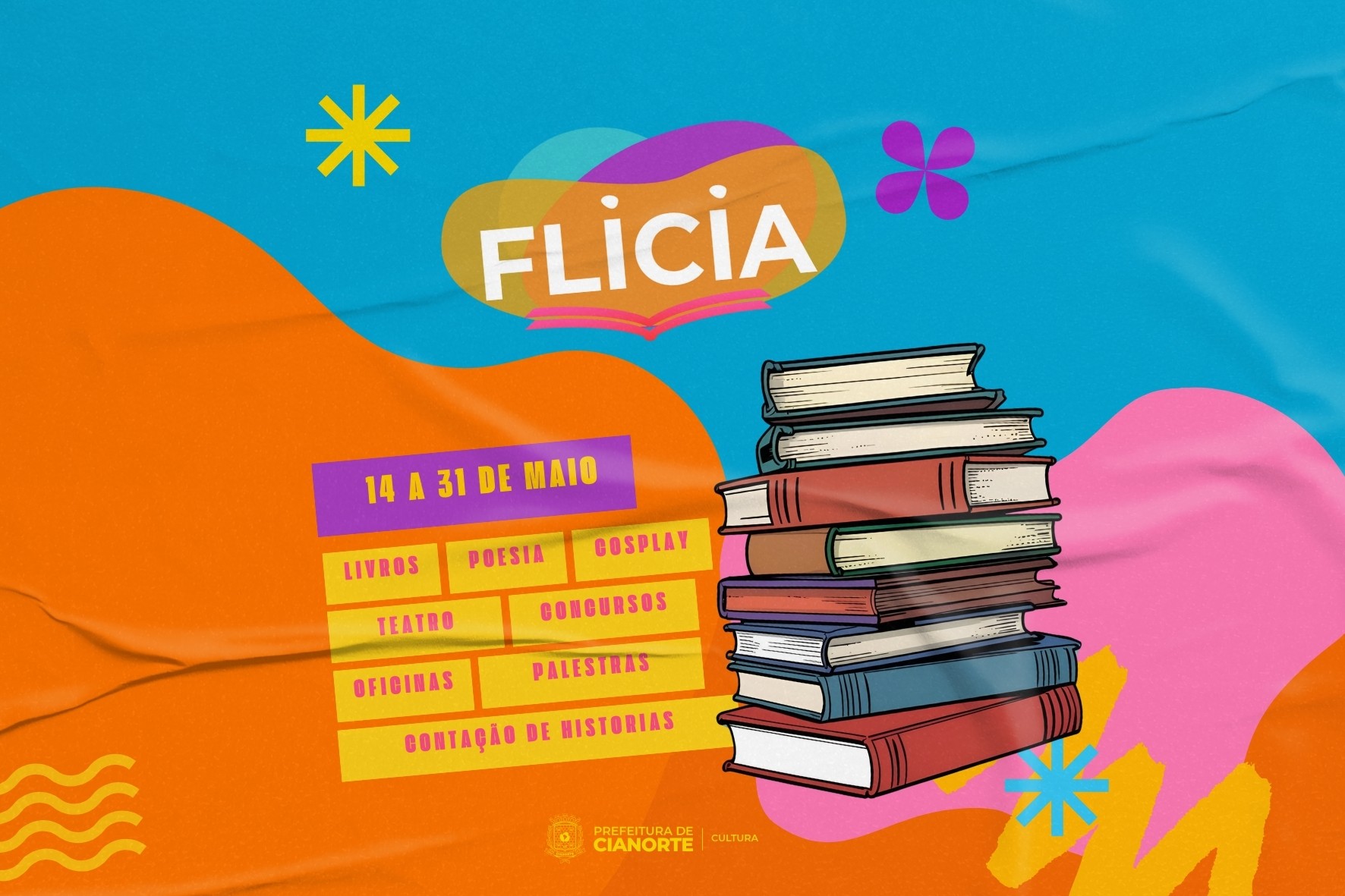 Cianorte se prepara para respirar literatura, durante a segunda quinzena de maio, com a chegada da 8ª edição da Festa Literária de Cianorte – Flicia. Com uma programação inteiramente gratuita e diversificada, o evento promete encantar tanto o público infantojuvenil quanto o adulto, oferecendo opções de cultura e entretenimento de 14 a 31 de maio. A programação e os links para inscrição nas diversas atividades estão disponíveis na página da Secretaria Municipal de Cultura (www.cianorte.pr.gov.br/cultura).