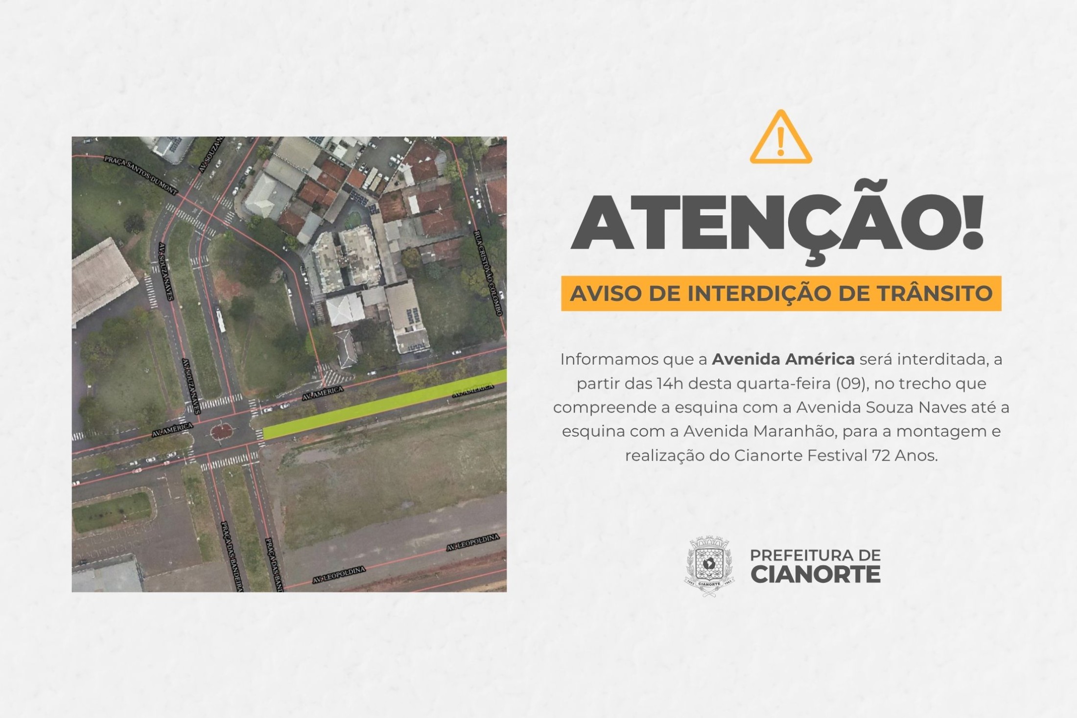Informamos que a Avenida América será interditada, a partir das 14h desta quarta-feira (09), no trecho que compreende a esquina com a Avenida Souza Naves até a esquina com a Avenida Maranhão, para a montagem e realização do Cianorte Festival 72 Anos.