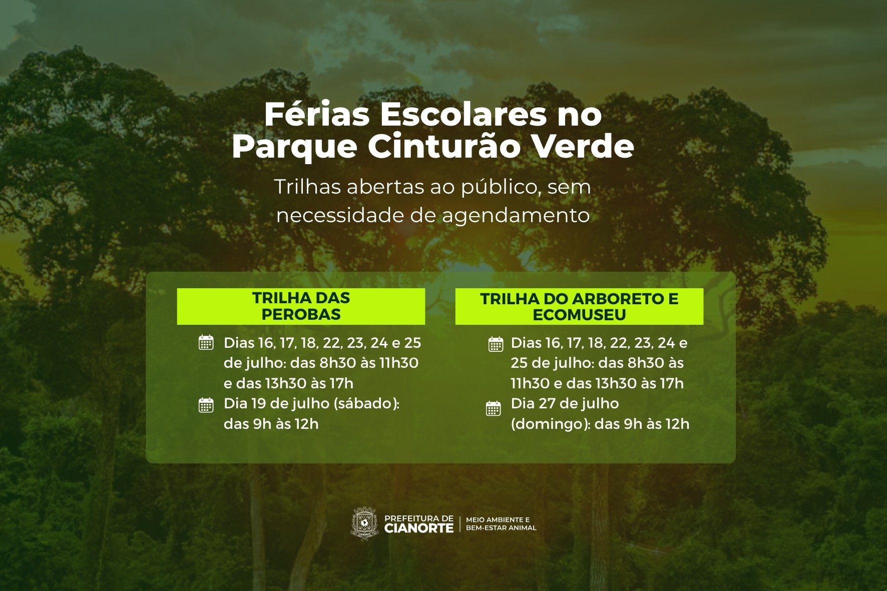 “A abertura das trilhas durante as férias escolares é uma excelente oportunidade para crianças e adolescentes trocarem as telas por paisagens naturais, incentivando a prática de atividades físicas e o apreço pela conservação ambiental. É também uma ótima pedida para adultos que desejam desfrutar da tranquilidade e da beleza do Cinturão Verde”, ressaltou a secretária municipal de Meio Ambiente e Bem Estar Animal, Daniella Carraro Parreiras.