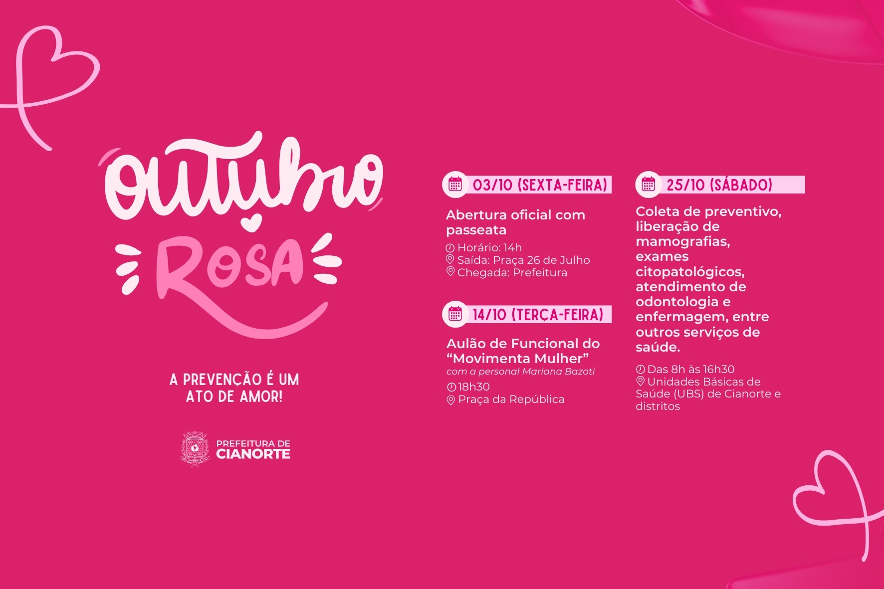 O ponto alto da campanha será no dia 25, sábado, com um mutirão nas Unidades Básicas de Saúde (UBS) de Cianorte e distritos. Das 8h às 16h30, serão oferecidos serviços essenciais como coleta de preventivo, liberação de mamografias e exames citopatológicos. Além disso, a população terá acesso a atendimentos de odontologia e enfermagem, entre outros.