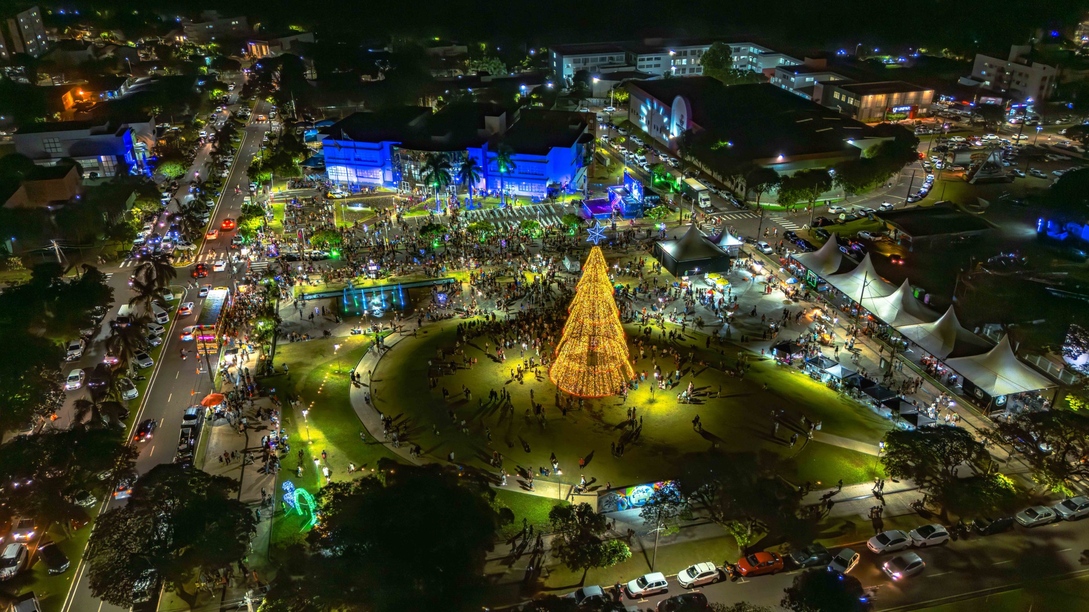 A festa não se limitou ao palco. O entorno da praça transformou-se em um verdadeiro polo de celebração, com a vila gastronômica, feira natalina e parque infantil. Para quem gosta de agito, a Carreta da Alegria do Programa Ação Solidária (PAS) garantiu a diversão.
