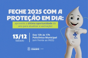 Os cianortenses podem fechar o ano com a proteção em dia: neste sábado (13), a Policlínica Municipal (em frente ao INSS) oferece os serviços de vacinação, das 13h às 17h, para a população em geral. Estão disponíveis todas as doses do Calendário Nacional de Imunização, incluindo a recém-integrada vacina contra o Vírus Sincicial Respiratório (VSR), destinada a gestantes a partir de 28 semanas.
