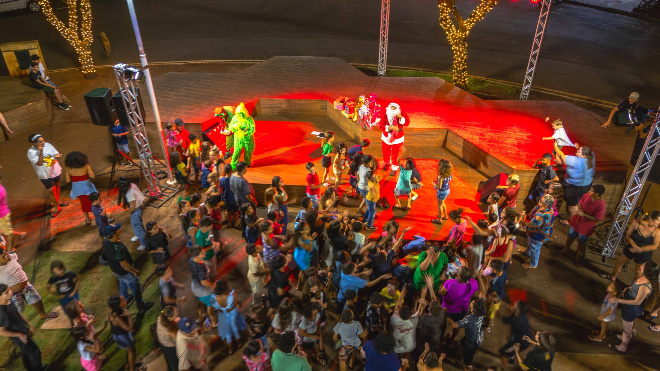 Em Vidigal, a festa estava inicialmente prevista para a segunda-feira (15), mas as condições climáticas forçaram o adiamento. Demonstrando resiliência, a comunidade compareceu em peso na quarta-feira (17) à Praça Altino Volpato. O destaque da noite foi a apresentação da CIA Ruah de Teatro, que encenou a peça “Cadê a magia do Natal?”. O espetáculo lúdico prendeu a atenção de crianças e adultos, preparando o terreno para o momento mais aguardado: o encontro com o Bom Velhinho.