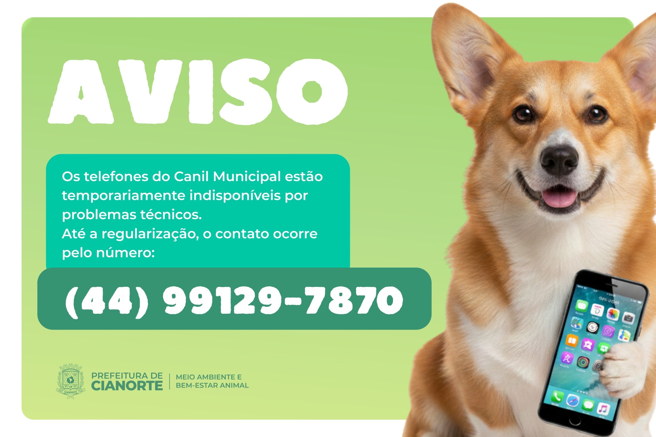 Até que a situação seja regularizada, o atendimento ao público e demais contatos relacionados ao Canil Municipal estão sendo realizados exclusivamente pelo número provisório (44) 99129-7870.