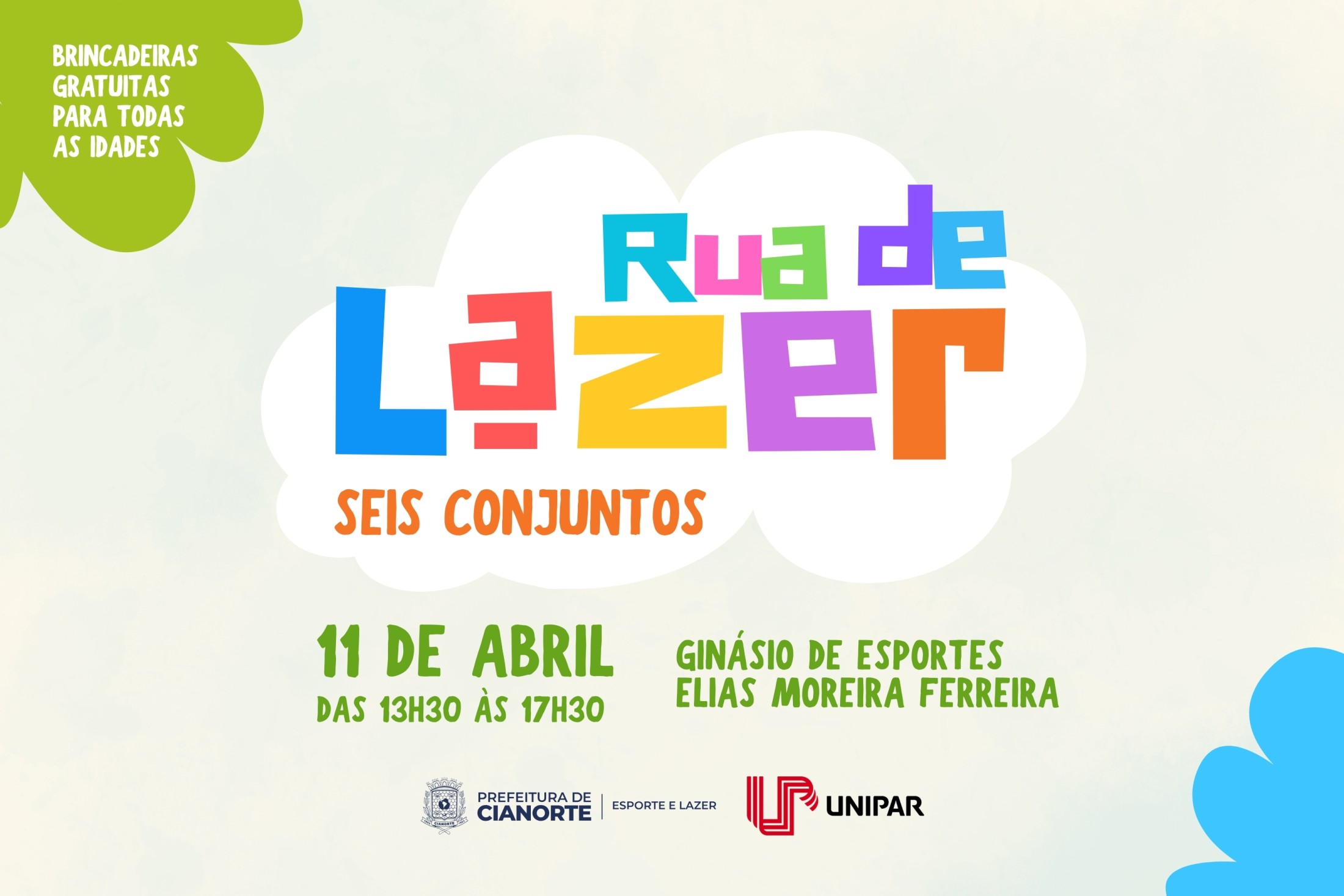Neste sábado (11), o Ginásio de Esportes Elias Moreira Ferreira, nos Seis Conjuntos, será palco de uma tarde repleta de alegria. O projeto Rua de Lazer, realizado pela Secretaria Municipal de Esporte com o apoio da Unipar, acontece das 13h30 às 17h30, oferecendo gincanas, brinquedos infláveis, camas elásticas, pinturas faciais e diversas atividades recreativas.