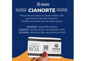 Em Cianorte, a Secretaria Municipal de Assistência Social já está em posse dos cartões Comida Boa, do Programa Estadual de Transferência de Renda – PETR. O repasse foi realizado pelo Escritório Regional da Secretaria da Justiça, Família e Trabalho nessa sexta-feira (17) e a distribuição aos 595 beneficiários começa nesta segunda-feira (20), até a quarta-feira (22). A lista dos contemplados está disponível para consulta pelo site do Município, através do link http://upload.cianorte.pr.gov.br/paginas/secretarias/assistencia-social/Comida Boa Lista de beneficiarios.pdf.