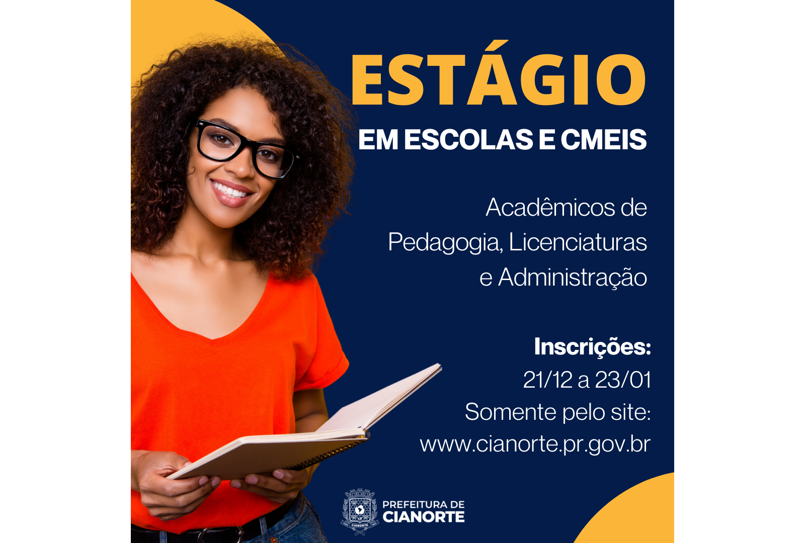 A partir desta terça-feira (21), a Prefeitura de Cianorte, por meio da Secretaria Municipal de Educação e Cultura, abre as inscrições para acadêmicos de Pedagogia, licenciaturas em geral e Administração que desejam estagiar em uma das 28 instituições de ensino da sede e dos distritos de São Lourenço e Vidigal.