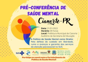 Debater temas relevantes e discutir os avanços e desafios da Política Nacional de Saúde Mental, Álcool e Outras Drogas no Paraná. Com esses objetivos, a Prefeitura, por meio da Secretaria Municipal de Saúde, em parceria com os conselhos Municipal e Estadual de Saúde e 13ª Regional de Saúde, realiza no próximo dia 31 de janeiro, às 9h, a Pré-Conferência de Saúde Mental. Com o tema “A Política de Saúde Mental como Direito: pela defesa do cuidado em liberdade, rumo a avanços e garantia dos serviços da atenção psicossocial no SUS”, o evento acontecerá no Auditório da Educação, no Paço Municipal.