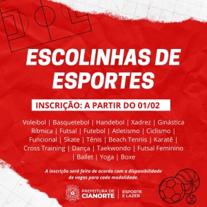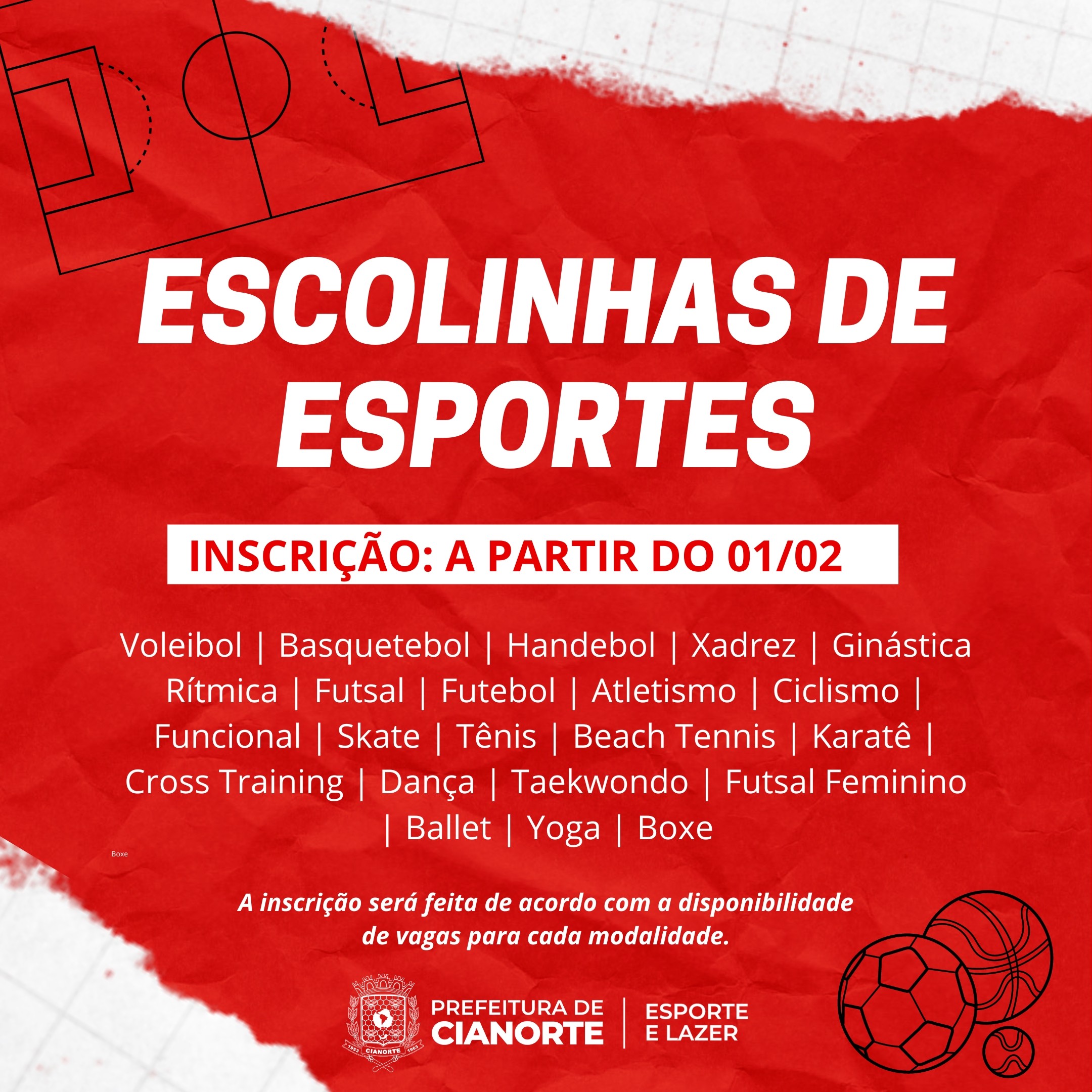 Com intuito de promover a prática de atividades físicas e melhorar a qualidade de vida da população, a Prefeitura de Cianorte, por meio da Secretaria Municipal de Esporte e Lazer (SMEL), abre na próxima terça-feira (1º) as inscrições para as escolinhas de esportes. Os interessados, com idade a partir de cinco anos, devem realizar a inscrição acessando o site da Prefeitura no link (https://docs.google.com/forms/d/e/1FAIpQLSfA2-Vn4SJZKp4cgWcdqjL5_OUbw4QWaelg0DLKmS0c5XG7PA/viewform). As atividades começam dia 14 de fevereiro.