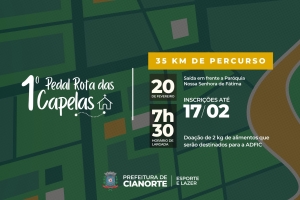 Já estão abertas as inscrições para a 1º Pedal Rota das Capelas. O evento é organizado pela Prefeitura de Cianorte, por meio da Secretaria Municipal de Esporte e Lazer (SMEL), e acontece no próximo dia 20 de fevereiro. A iniciativa, que é direcionada para ciclistas praticantes de Mountain Bike não competitivos, faz parte do Projeto Esporte de Aventura e Natureza, em parceira com a Coordenadoria de Turismo, Santuário Eucarístico Diocesano, Associação do Deficiente Físico de Cianorte, Unipar e Fundação Hospitalar do Paraná (Fundhospar).