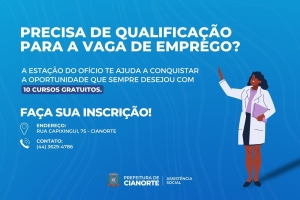 A Prefeitura de Cianorte, por meio da Secretaria Municipal de Assistência Social e Estação do Ofício, abriu, nessa segunda-feira (07), as inscrições para seis cursos profissionalizantes gratuitos, sendo: Gestão de processos administrativos; Técnicas de serviço de supermercado; Design de sobrancelhas; Introdução ao trabalho de manicure e pedicure; Depilação e Informática. As capacitações foram adquiridas junto ao Serviço Nacional de Aprendizagem Industrial (SENAI) e Serviço Nacional de Aprendizagem Comercial (SENAC). O prazo segue até 11 de março.