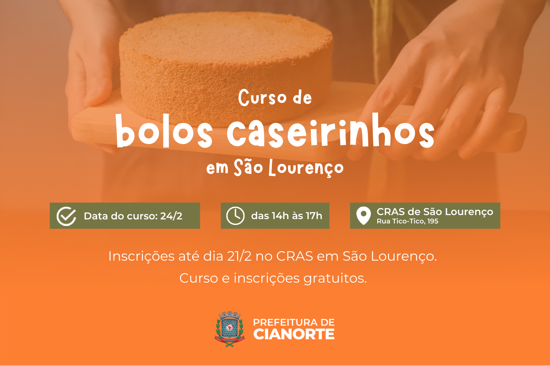 As mulheres residentes no distrito de São Lourenço, com idade a partir dos 18 anos, têm a oportunidade de aprender um novo ofício para a geração de renda: o Curso de Bolos Caseirinhos da Secretaria Municipal de Políticas Públicas para Mulheres, Crianças e Adolescentes. As inscrições estão abertas e seguem até a segunda-feira (21) ou até esgotar o limite das vagas, na unidade do CRAS local (Rua Tico-Tico, 195).