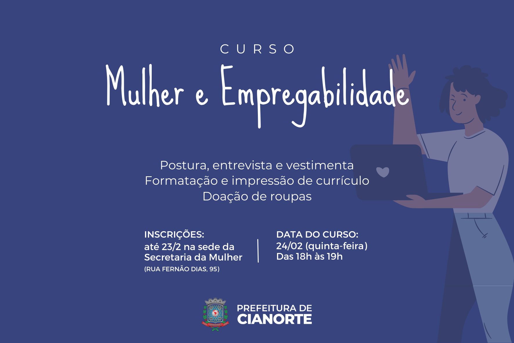 A Secretaria Municipal de Políticas Públicas para Mulheres, Crianças e Adolescentes está com inscrições abertas para o Curso Mulher e Empregabilidade. A iniciativa visa auxiliar a população feminina em situação de vulnerabilidade social na busca por colocação no mercado de trabalho, por meio de capacitação sobre postura, entrevista e vestimenta, além do fornecimento da formatação e impressão de currículo e a doação de roupas.