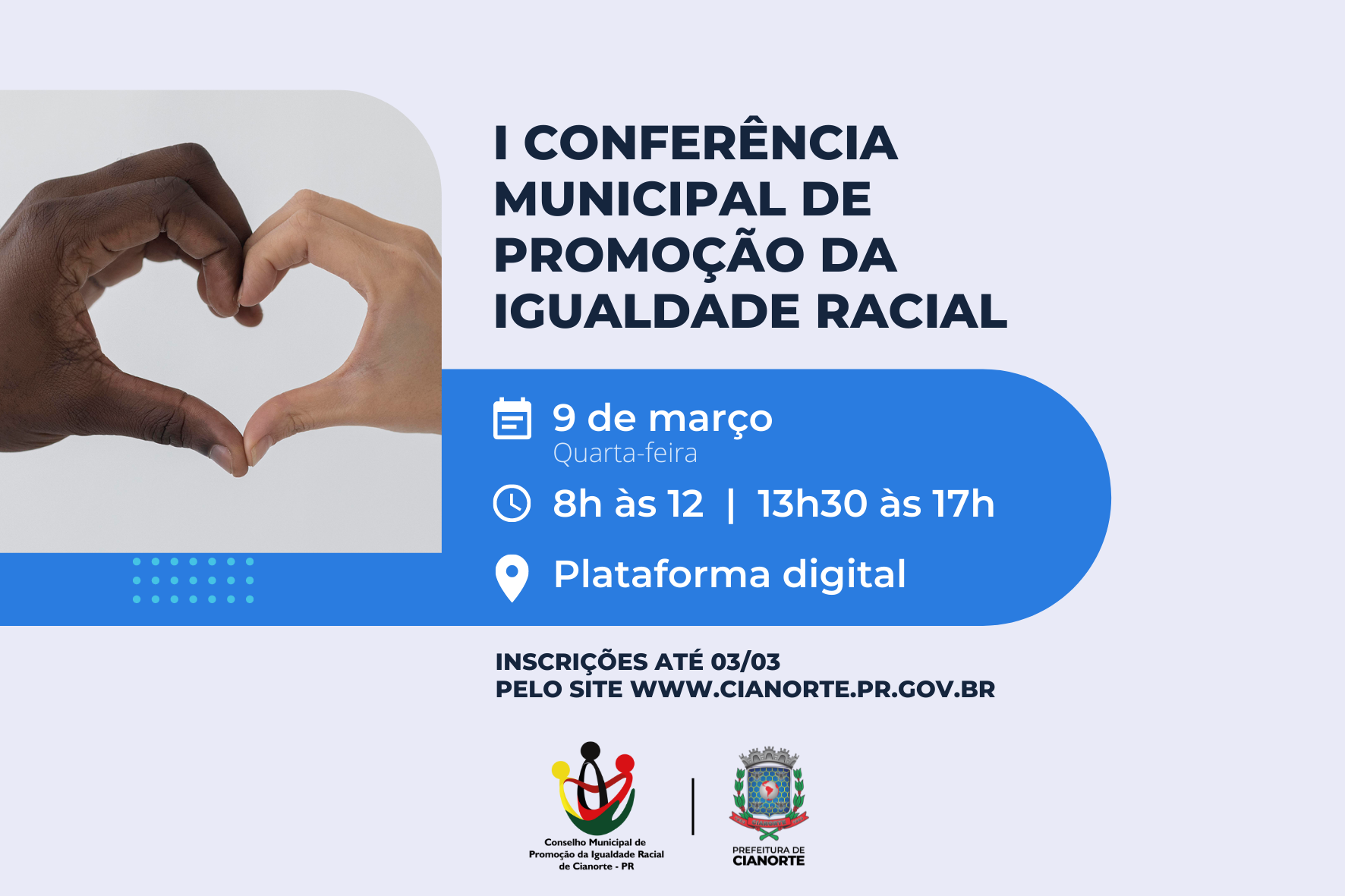 Com o tema o "Enfrentamento ao racismo e às outras formas correlatas de discriminação étnico-racial e de intolerância religiosa: política de Estado e responsabilidade de todos nós", a 1ª Conferência Municipal de Promoção da Igualdade Racial já tem data para acontecer em Cianorte: dia 09 de março, de maneira híbrida (presencial e virtual), das 8h às 12h e das 13h30 às 17h. Os interessados em participar devem efetuar inscrição até a próxima quinta-feira (03), por formulário on-line https://forms.gle/qnip3AZeBkx3hoEv9.