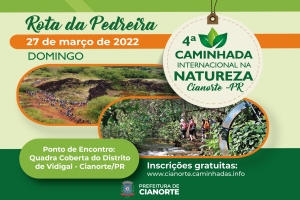 Quem aprecia a realização de atividade física ao ar livre, em meio à natureza, já pode se preparar para a 4ª edição da Caminhada Internacional na Natureza – Rota da Pedreira: as inscrições começam neste domingo (27), pelo site www.cianorte.caminhadas.info. A participação é gratuita e aberta ao público em geral, desde crianças aos idosos. O evento está marcado para o dia 27 de março (domingo), com concentração e credenciamento a partir das 7h, na quadra coberta do distrito de Vidigal.