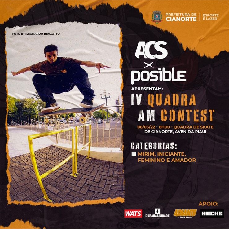 Neste domingo (06), acontece, na quadra de skate de Cianorte, localizada na Praça Olímpica, o “IV Quadra AM Contest”. O evento é organizado pela Associação Cianortense de Skate (ASC) e conta com o apoio da Prefeitura de Cianorte, por meio da Secretaria Municipal de Esporte e Lazer.