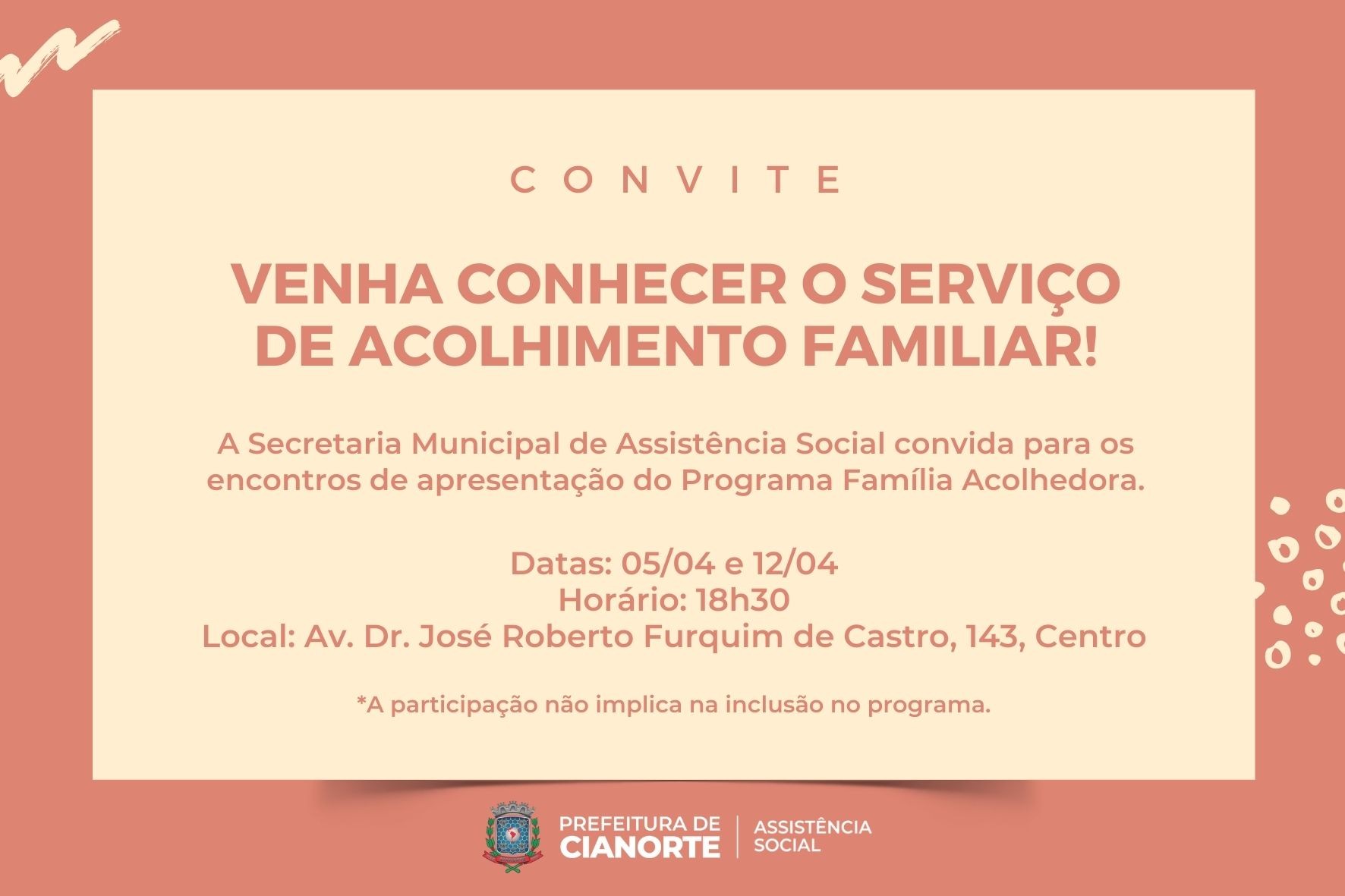 Os interessados em saber mais sobre o Serviço de Acolhimento e, possivelmente, fazer parte do Programa Família Acolhedora, já podem se preparar: a Secretaria Municipal de Assistência Social promoverá dois encontros para apresentação e diálogo, sendo o primeiro em 05 de abril e o segundo no dia 12, ambos às 18h30, na Avenida Dr. José Roberto Furquim de Castro, 143, Centro. A participação é aberta ao público e não é necessário efetuar inscrição.