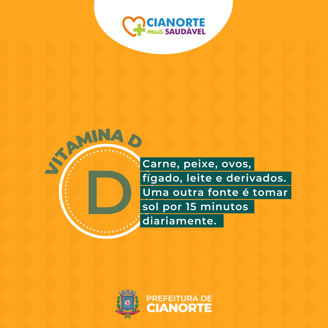 Vitamina D: carne, peixe, ovos, fígado, leite e derivados. Uma outra fonte é tomar sol por 15 minutos diariamente;