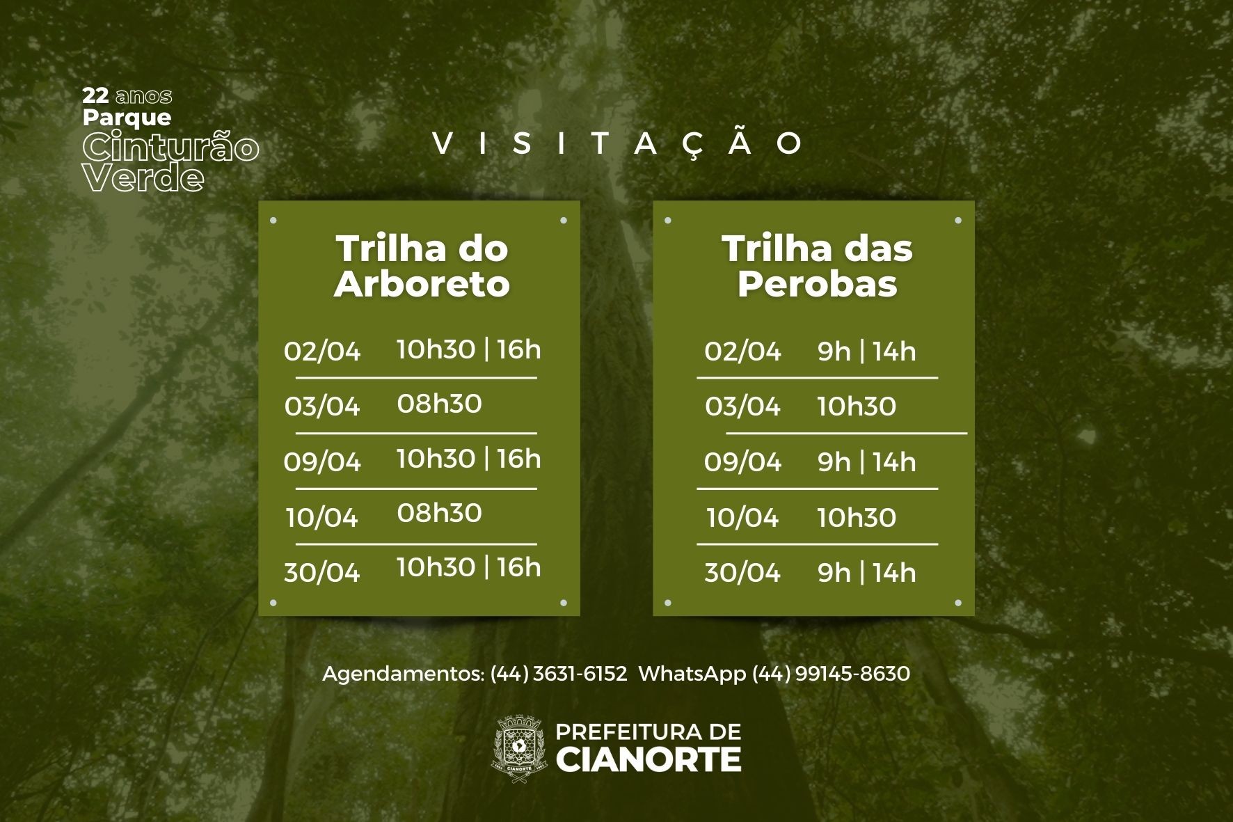 Nos meses de abril e maio, integrando a celebração dos 22 anos do Parque Municipal Cinturão Verde, a Trilha das Perobas e a Trilha do Arboreto abrem para visitação guiada aos finais de semana. Para participar é necessário efetuar agendamento pelo telefone (44) 3631-6152 ou WhatsApp (44) 99145-8630, de segunda a sexta-feira, das 8h às 12h ou das 13h30 às 17h30. Os passeios acontecem aos sábados e domingos, sendo: