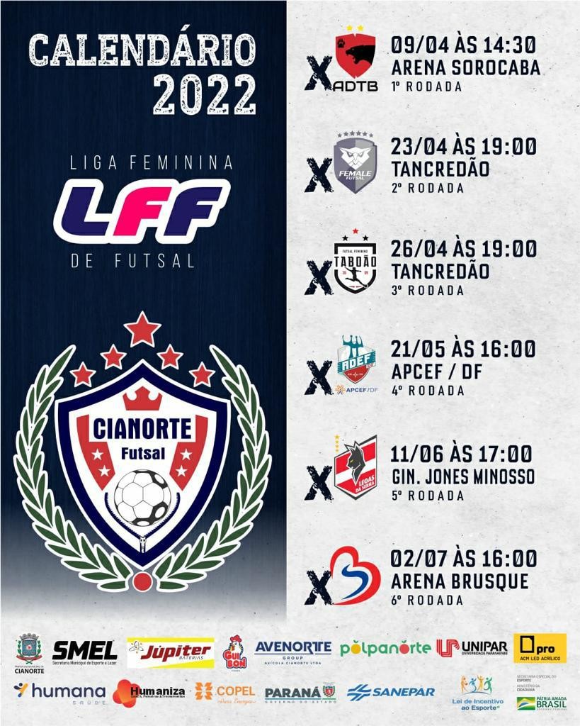 MAIS JOGOS – Além do jogo de estreia, contra o ADTB, o Cianorte Futsal Feminino já tem definido os próximos adversários na competição. No dia 23/04, às 19h, enfrenta o Female/Unochapecó, de Chapecó (SC), no Ginásio de Esportes Tancredo Neves (Tancredão). Já no dia 26/04, às 19h, a partida é contra o Taboão/Magnus, de Taboão da Serra (SP), também no Tancredão.