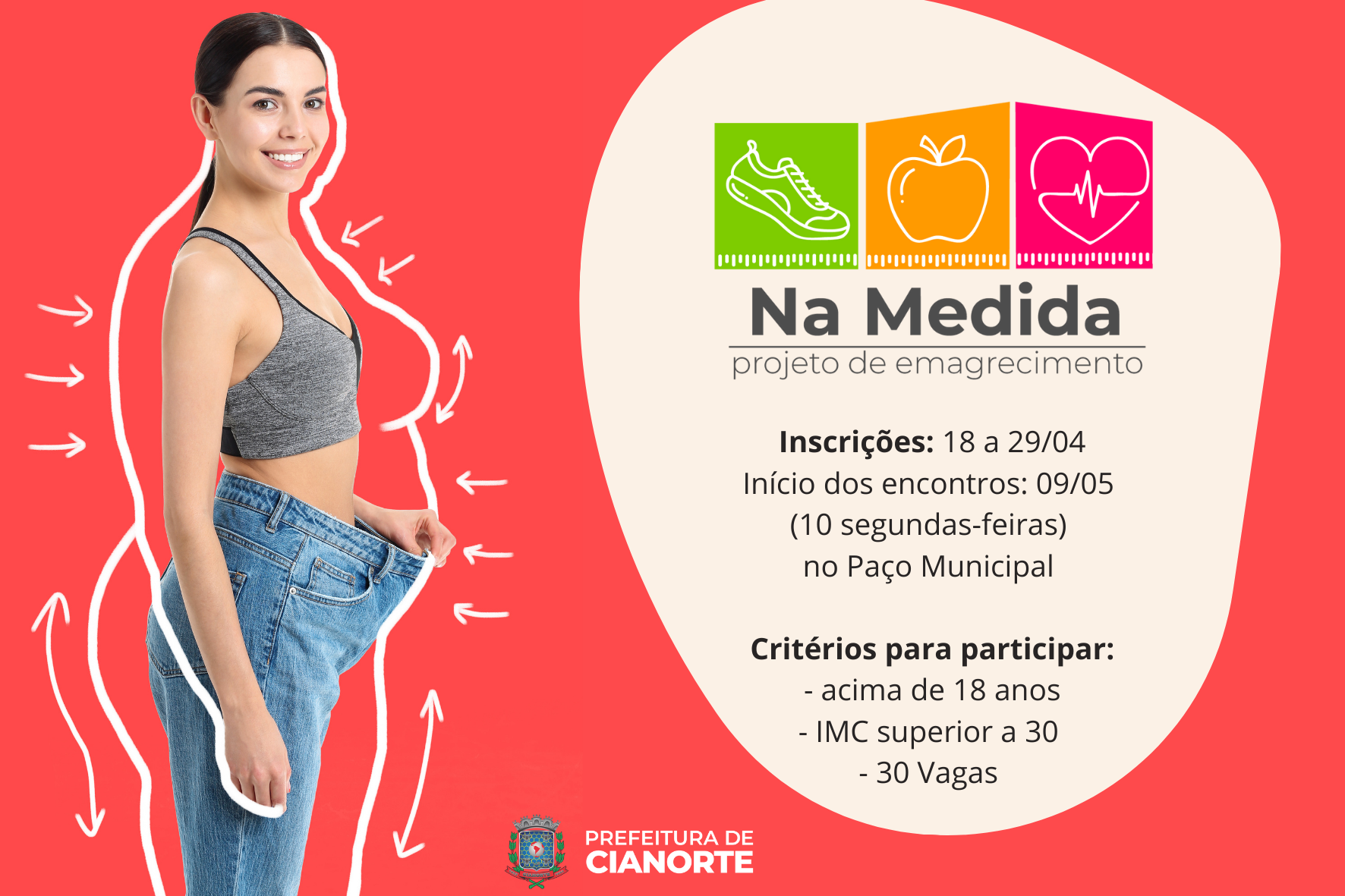 Os cianortenses com excesso de peso ou obesidade têm a oportunidade de emagrecer com orientação profissional: o Projeto Na Medida, da Secretaria Municipal de Saúde, está com inscrições abertas, a partir desta segunda-feira (18). A iniciativa é voltada às pessoas com idade a partir dos 18 anos e IMC (Índice de Massa Corporal) superior a 30. As vagas são limitadas a 30 participantes e os interessados devem fazer inscrição por formulário on-line (https://docs.google.com/forms/d/e/1FAIpQLSd1LBFQufJNCtsXcrCKddj1rvDjxnmCvz6GNXEOKAUmB5QLuA/viewform) ou presencialmente, no Setor de Protocolo do Paço Municipal, que atende de segunda a sexta-feira, das 8h às 12h e das 13h30 às 17h30.
