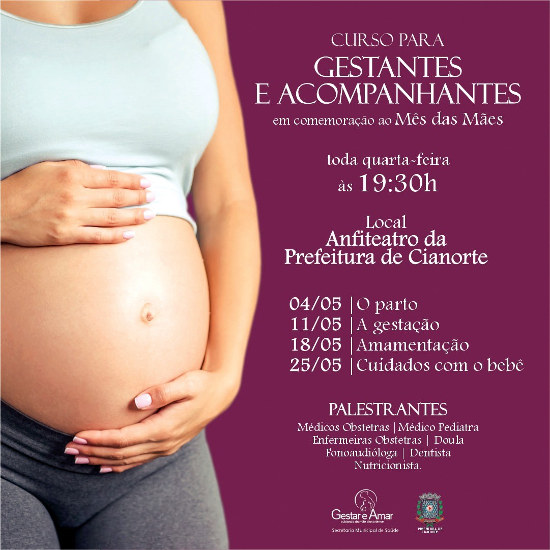 Após dois anos na modalidade on-line, em decorrência da pandemia, o curso para gestantes e acompanhantes da Secretaria Municipal de Saúde retorna às atividades presenciais. Em maio, mês em que se comemora o Dia das Mães, a iniciativa vem com uma edição especial. Todas as quartas-feiras, às 19h30, no auditório da Prefeitura, profissionais darão orientações e dicas que permeiam as diversas situações da gestação, puerpério e cuidados com o bebê.