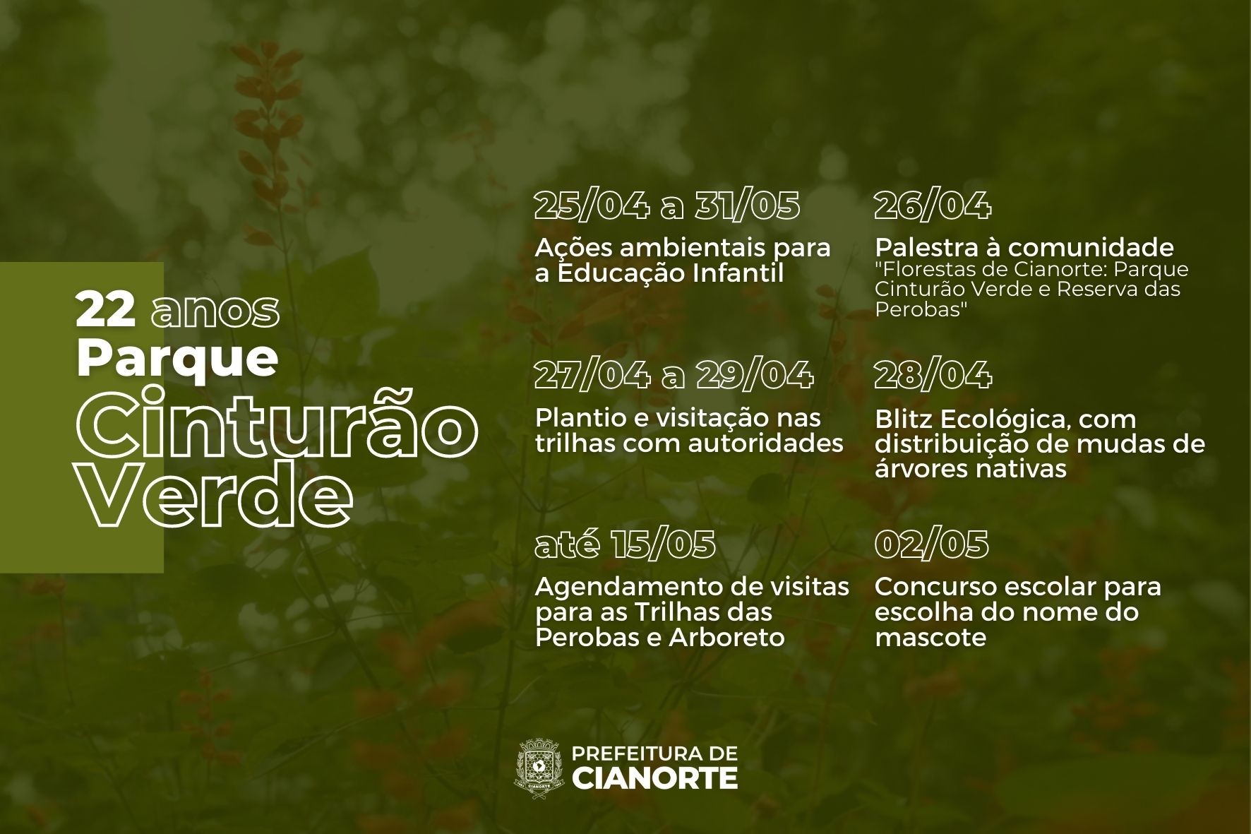 “Somos abençoados por contar com esse magnífico patrimônio natural e nossa missão é protegê-lo. Para isso, nada melhor do que uma programação repleta de atividades de sensibilização ambiental. Convidamos os cianortenses e visitantes para que participem”, destaca o prefeito, Marco Franzato.