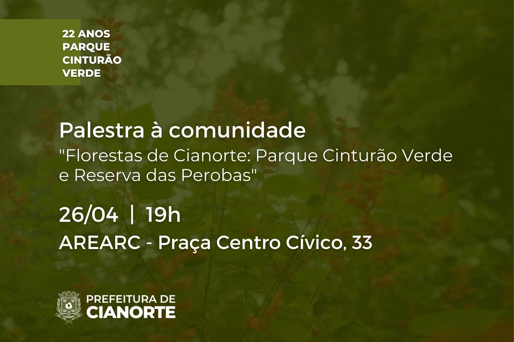 Parte da programação que celebra os 22 anos do Parque Cinturão Verde, uma palestra sobre as florestas urbanas de Cianorte está marcada para esta terça-feira (26), às 19h, no auditório da Associação Regional de Engenheiros, Arquitetos e Agrônomos de Cianorte (AREARC), localizada na Praça Centro Cívico, nº 33.