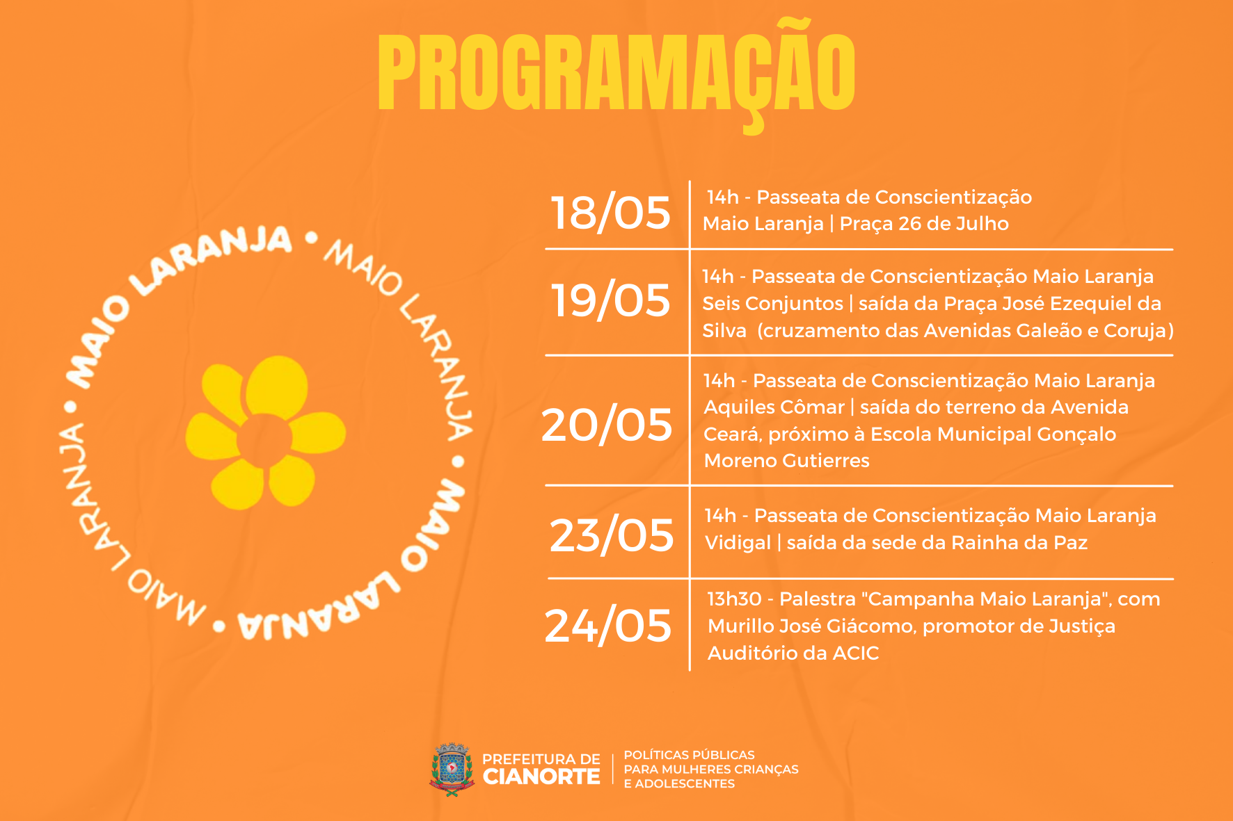 A programação do Maio Laranja conta com quatro passeatas de conscientização, todas com início às 14 horas: dia 18 de maio, no Centro, com saída da Praça 26 de Julho; dia 19 de maio, nos Seis Conjuntos, com saída da Praça José Ezequiel da Silva (cruzamento das Avenidas Galeão e Coruja); dia 20 de maio, no Aquiles Cômar, com saída do terreno da Avenida Ceará, próximo à Escola Municipal Gonçalo Moreno Gutierres; e no dia 23 de maio, no distrito de Vidigal, com saída da sede da Rainha da Paz. Para encerrar, no dia 24 de maio, também às 14 horas, será realizada uma palestra sobre o tema com o promotor de Justiça, dr. Murillo José Giácomo, na ACIC.