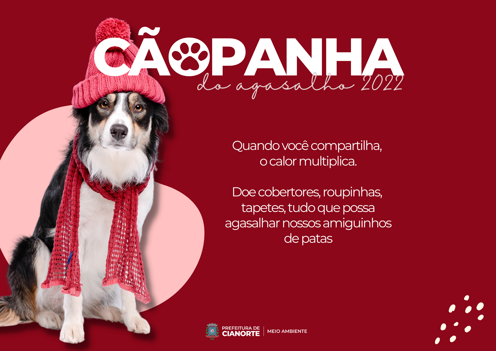 A Prefeitura, por meio da Secretaria Municipal de Meio Ambiente e Bem-Estar Animal, promove, entre os dias 06 de junho a 08 de julho, a “Cãopanha do Agasalho de 2022”, que consiste na doação de cobertores, roupinhas, tapetes e tudo que possa agasalhar os animaizinhos que vivem no Canil Municipal ou em situação de rua.