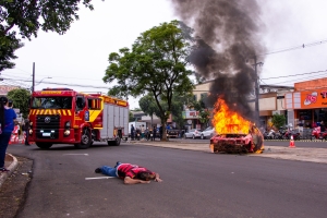Quem passou pelas proximidades da Praça da Bíblia, na manhã desta sexta-feira (03), pode notar uma movimentação diferente. Veículo em chamas, com um homem caído, carro batido com duas pessoas feridas e presas nas ferragens e uma mulher ao chão frente a uma moto compunham uma cena de acidente de trânsito que parou o centro da cidade. Felizmente, era apenas uma simulação de resgate, ação de encerramento da Campanha Maio Amarelo, de conscientização no trânsito.