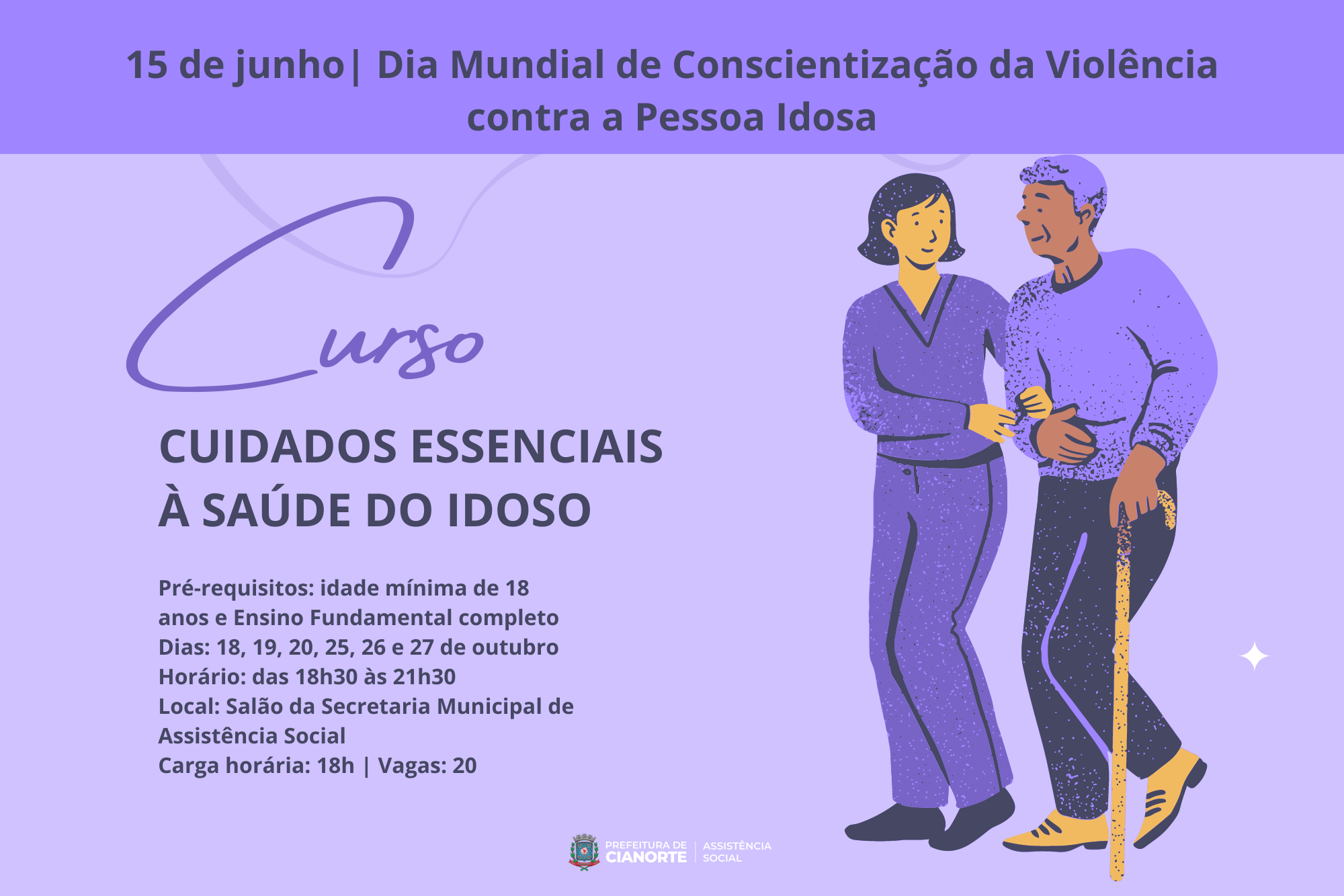 Em 15 de junho comemora-se o Dia Mundial de Conscientização da Violência Contra a Pessoa Idosa. Em alusão a esta importante data, a Secretaria Municipal de Assistência Social, em parceria com o Conselho Municipal de Direitos da Pessoa Idosa, lança o curso “Cuidados Essenciais à Saúde do Idoso”.