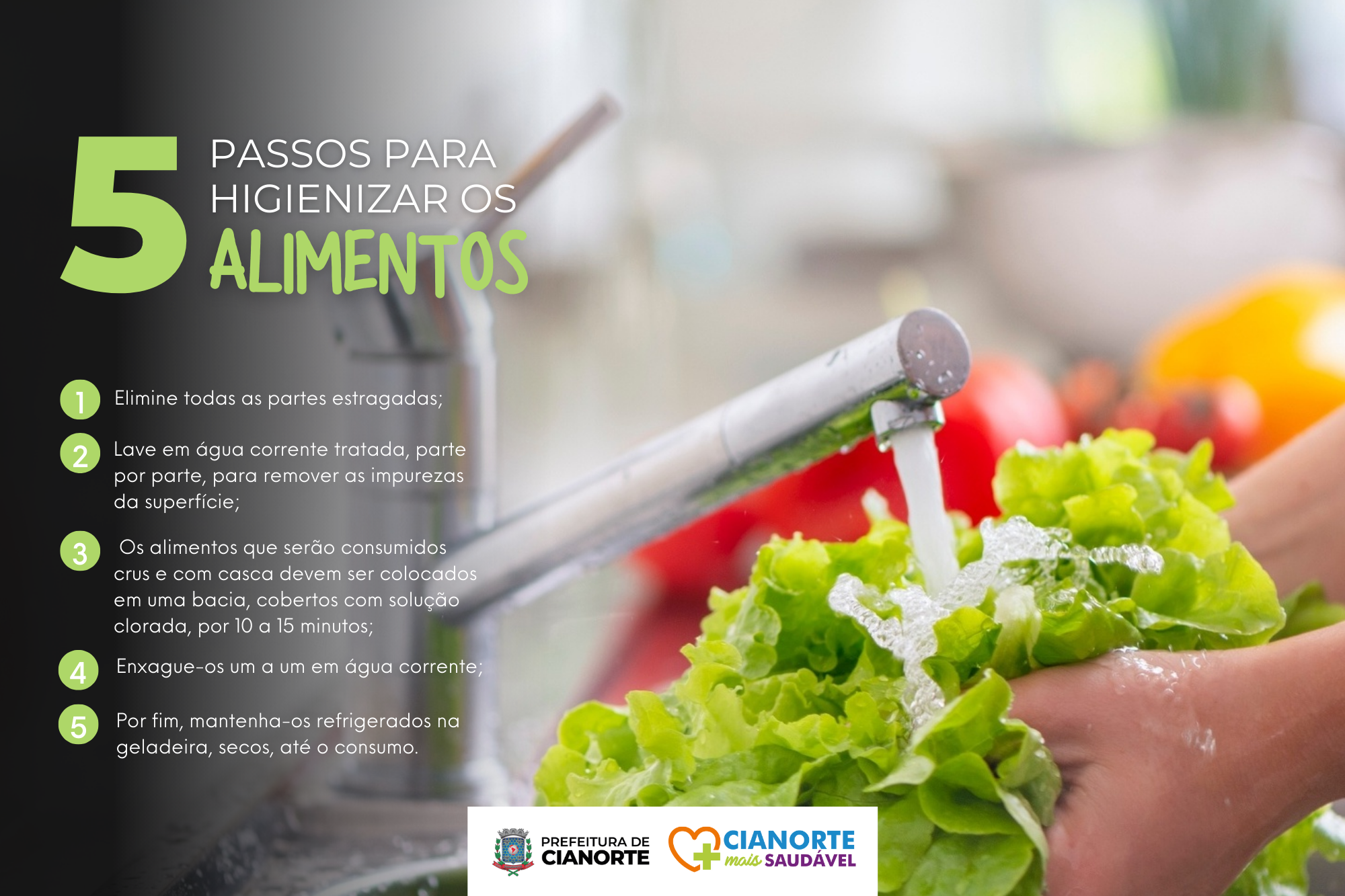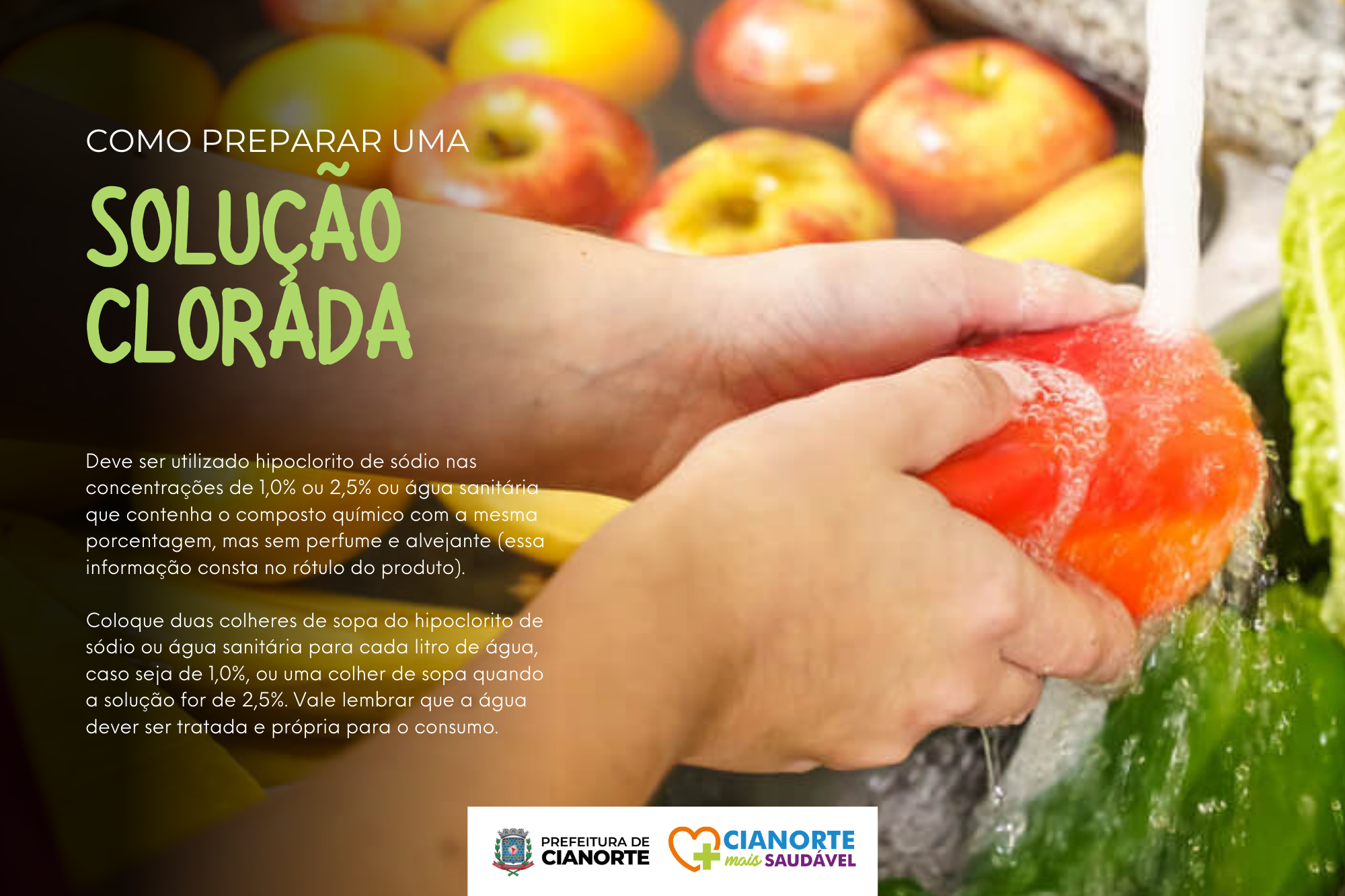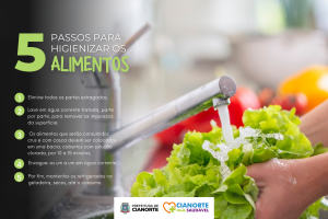 Mensalmente, o Plano Municipal de Segurança Alimentar e Nutricional apresenta o Projeto Cianorte Mais Saudável, que traz, em junho, dicas para a higienização de frutas, legumes e hortaliças. O processo, que deve ser feito de forma correta antes do consumo ou do preparo, é fundamental para evitar intoxicações e doenças transmitidas pelos alimentos que, por conta dos processos de produção e armazenamento, têm risco de contaminação por micro-organismos e resíduos de agrotóxicos.