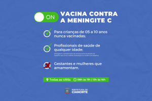 A Secretaria Municipal de Saúde informa que a imunização contra a meningite (Meningocócica C) foi ampliada para as crianças de 05 a 10 anos nunca vacinadas e profissionais de saúde de Cianorte e dos distritos de Vidigal e São Lourenço, sendo aplicada em todas as Unidades Básicas de Saúde (UBSs), de segunda a sexta-feira, das 08h às 11h e das 13h às 16h. A vacina não é indicada para gestantes e mulheres que amamentam.