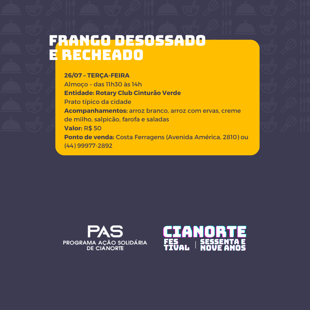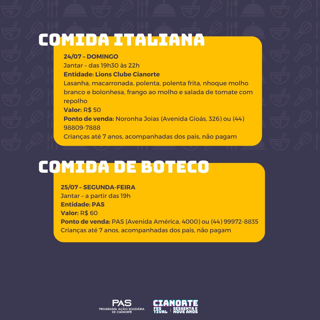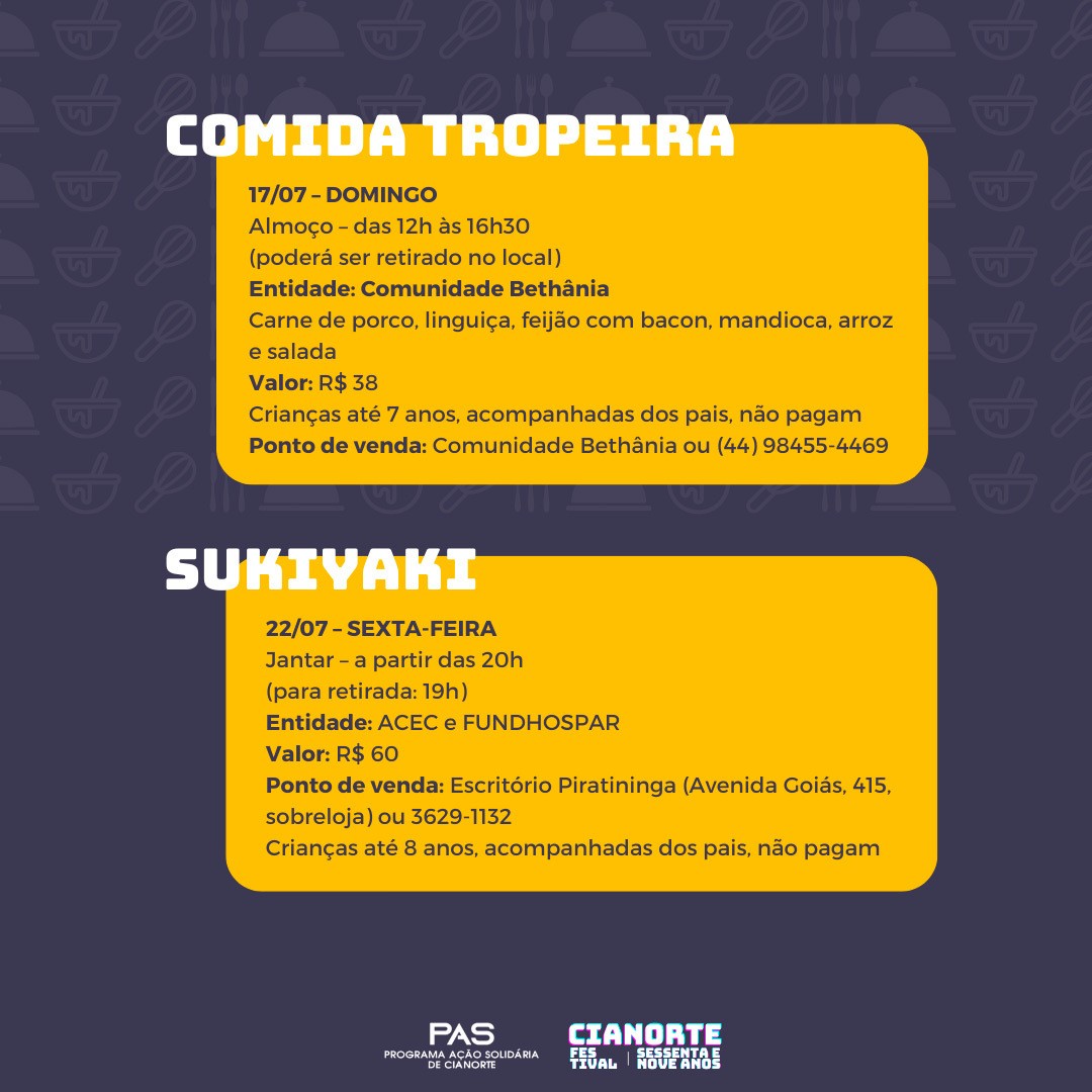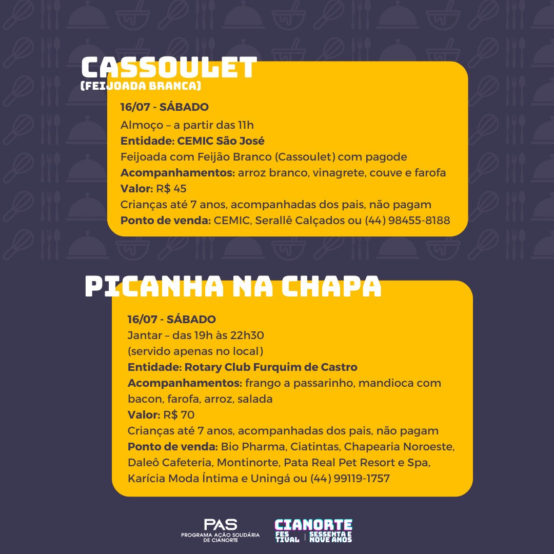 As opções são: a Feijoada Branca (Cassoulet) com pagode, do CEMIC São José (almoço, 16/07, R$ 45); a Picanha na Chapa do Rotary Club Furquim de Castro (jantar, 16/07, R$ 70); a Comida Tropeira da Comunidade Bethânia (almoço, 17/07, R$ 38); o Sukiyaki da ACEC em parceria com a Fundhospar (jantar, 22/07, R$ 60); a Costela Fogo de Chão do Rotary Club Cianorte (jantar, 23/07, R$ 60); o Porco no Tacho do Projeto Sou Vivo Não Uso Drogas (almoço, 24/07, R$ 40); a Comida Italiana do Lions Clube Cianorte (jantar, 24/07, R$ 50); a Comida de Boteco do PAS (jantar, 25/07, R$ 60); e o Frango Desossado e Recheado do Rotary Club Cinturão Verde (almoço, 26/07, R$ 50).