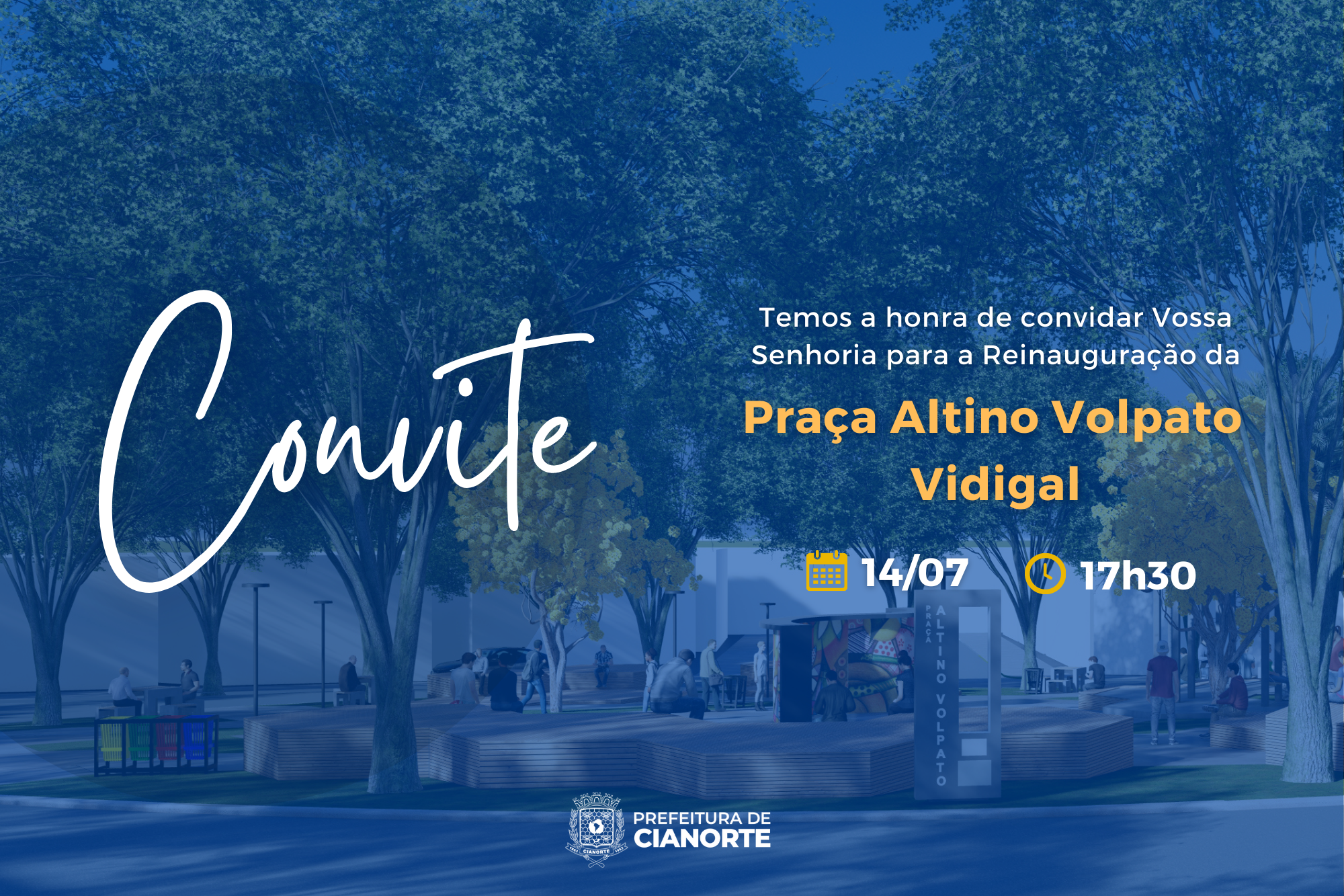 A Prefeitura de Cianorte inaugura nesta quinta-feira (14) a revitalização da Praça Altino Volpato, em Vidigal. O local teve seus 1.330 m² completamente transformados, somando investimentos próprios de, aproximadamente, R$300 mil. O evento inaugural acontecerá a partir das 17h30 e contará com apresentação do cianortense Jailson Marcelino, que executará canções de viola caipira.