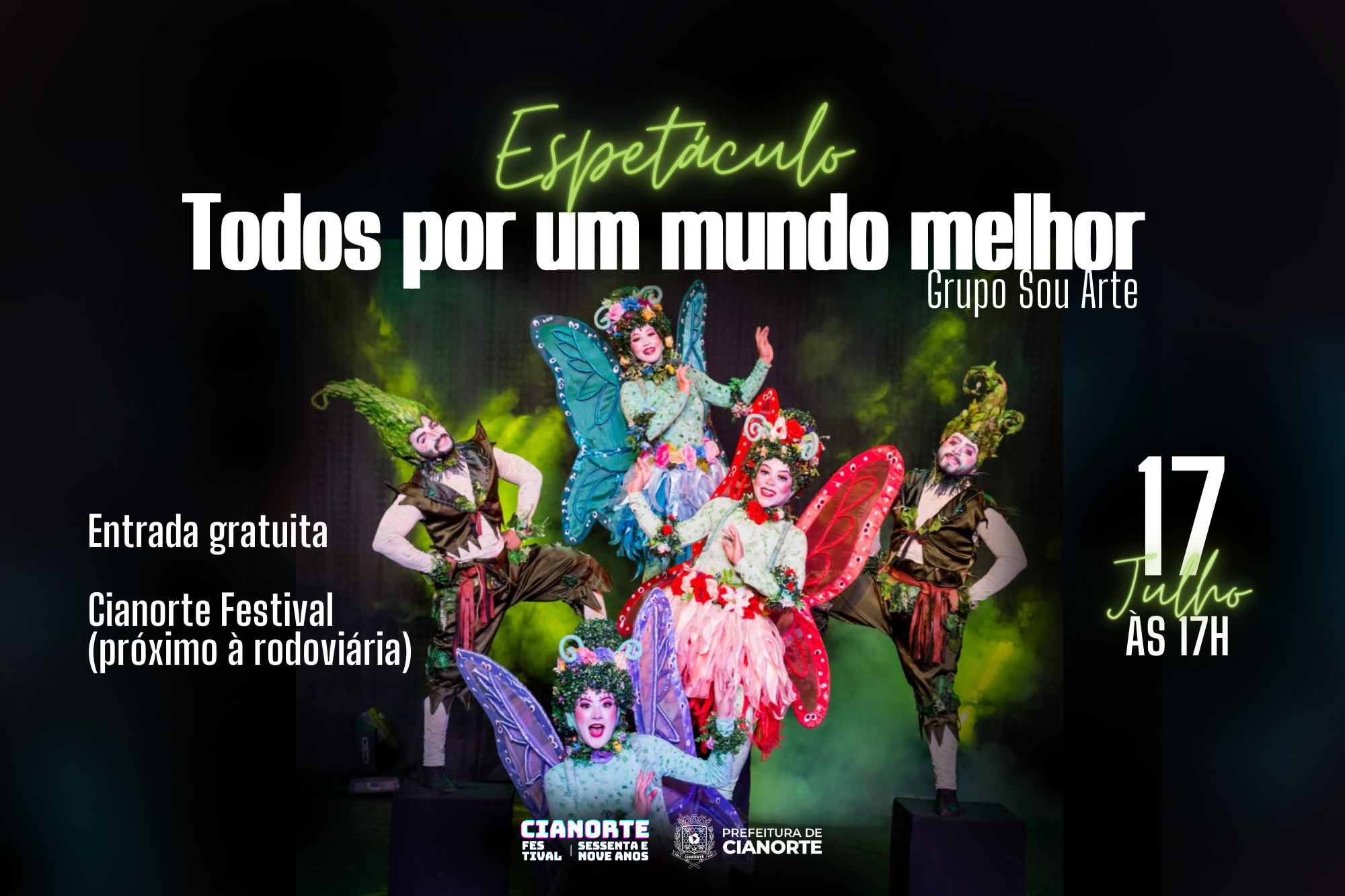 Na data em que se celebra o Dia Mundial de Proteção às Florestas, neste domingo (17), a Secretaria Municipal de Meio Ambiente e Bem-Estar Animal promove um espetáculo infantojuvenil para sensibilizar os cianortenses: “Todos por um mundo melhor”, encenado pelo Grupo Sou Arte que, de forma lúdica e bem humorada, trata das questões relacionadas à preservação da natureza, a importância da separação do lixo e sua reciclagem.