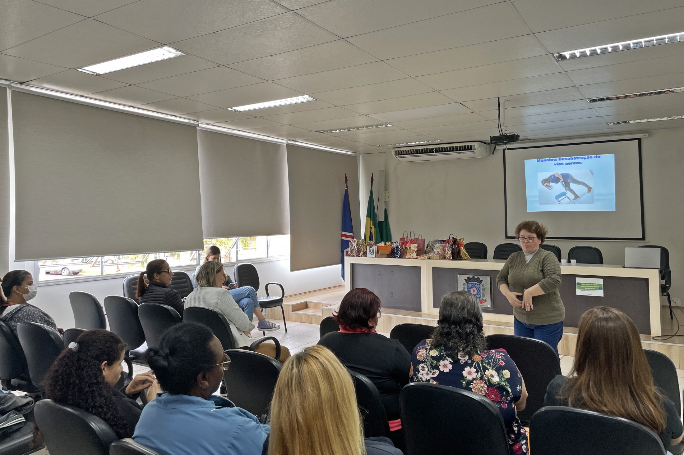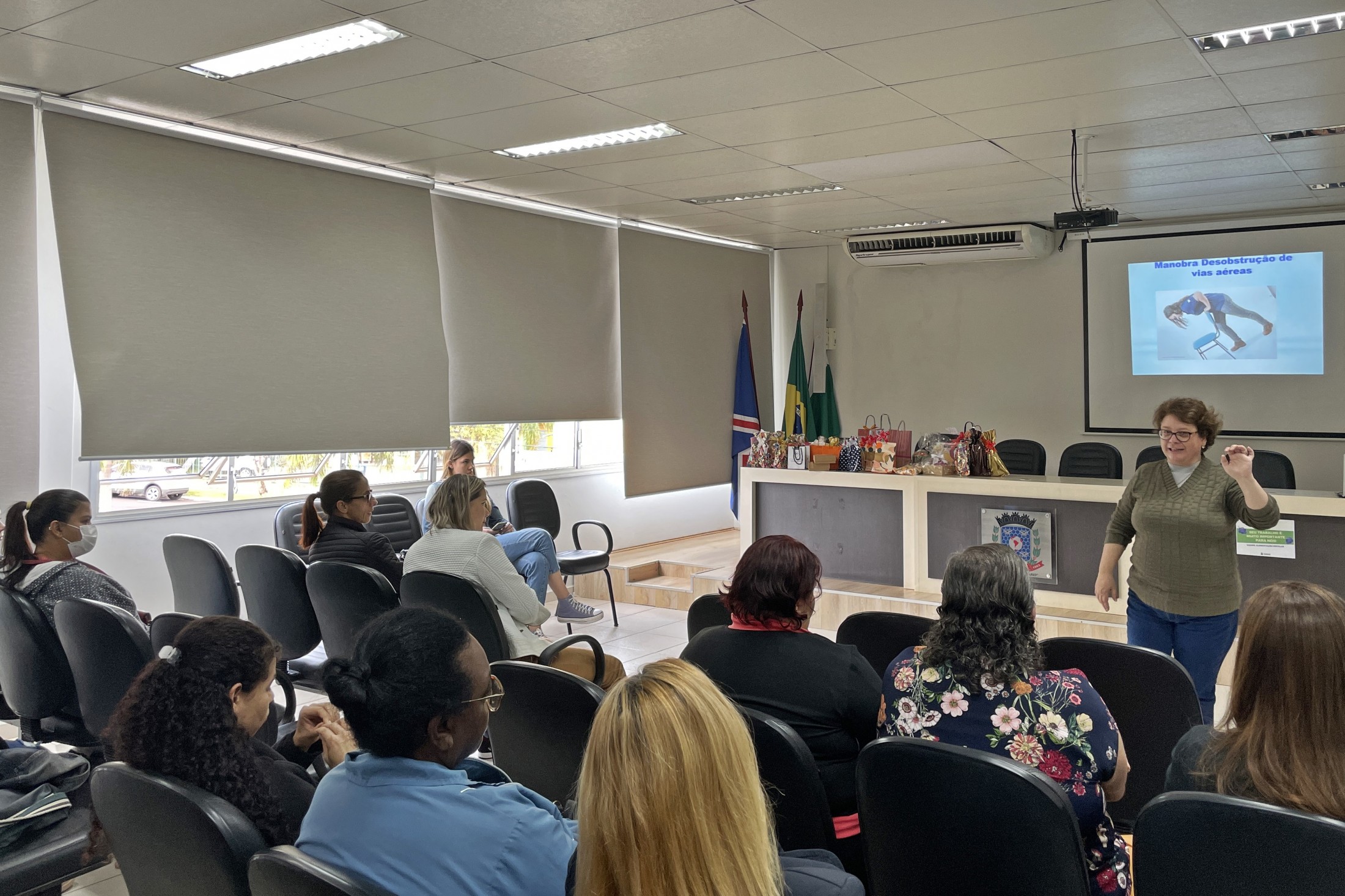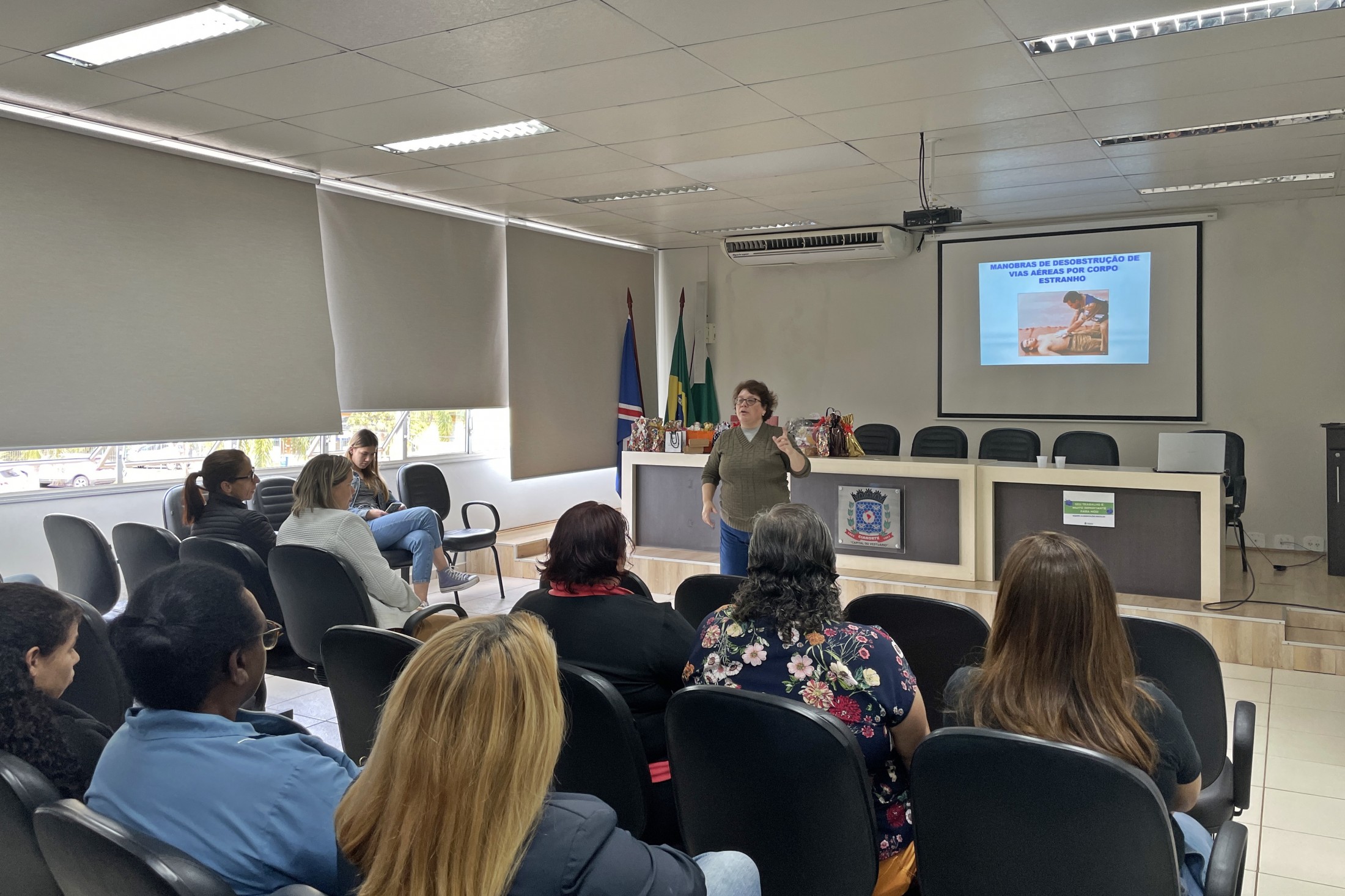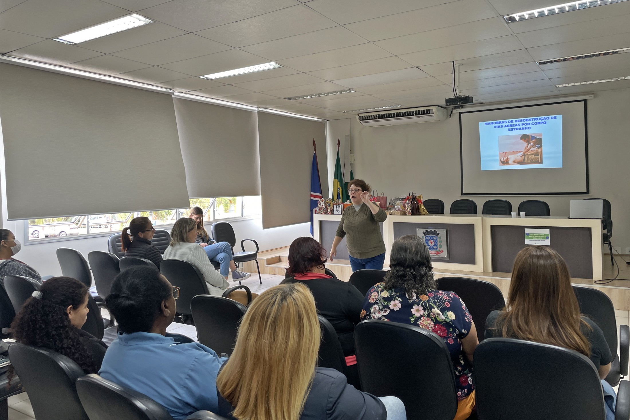 Durante o período de recesso escolar, os servidores da Secretaria Municipal de Educação recebem capacitação para aprimorar o trabalho no dia a dia. Nesta última segunda-feira (18), as merendeiras das Escolas Municipais tiveram uma qualificação sobre primeiros socorros e orientações gerais. A formação aconteceu no auditório do Paço Municipal e foi ministrada pela enfermeira Andreia Pizani Domingos.