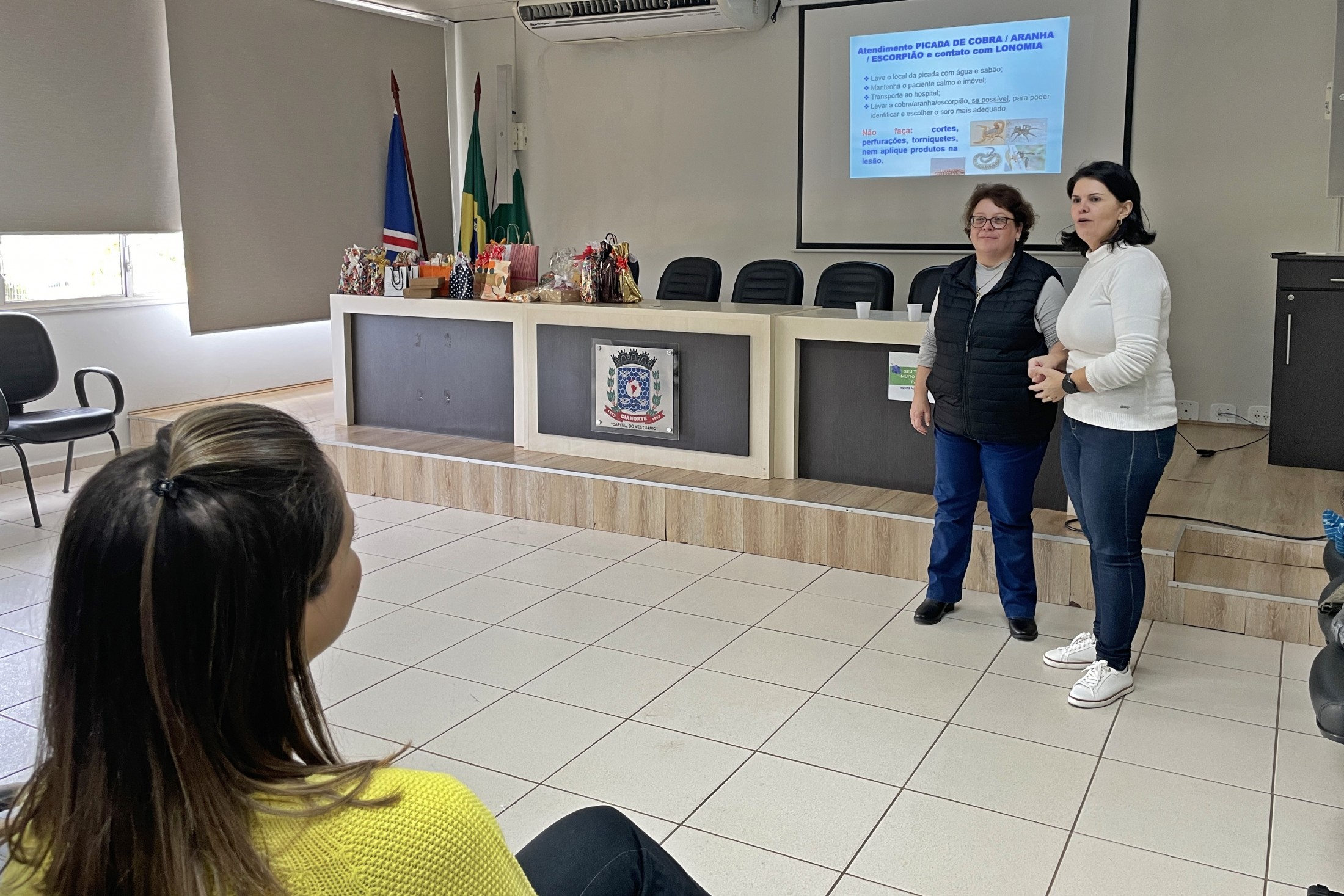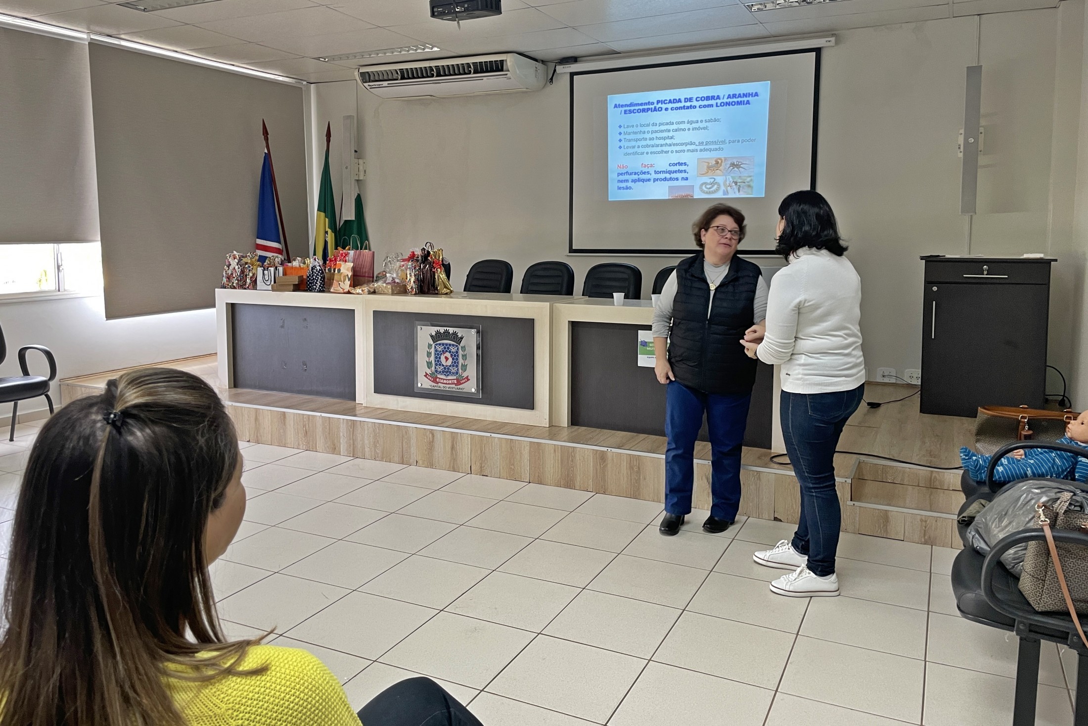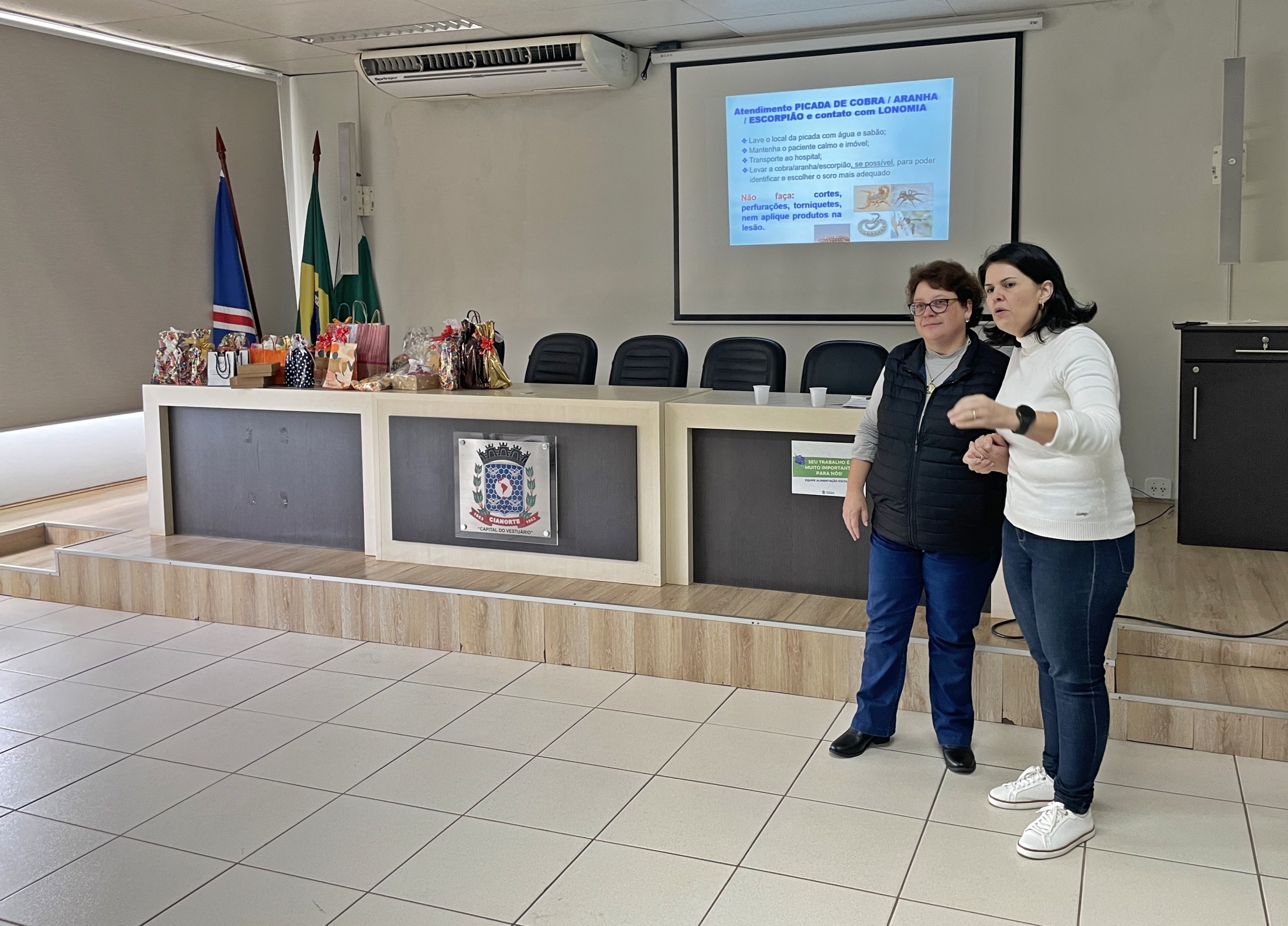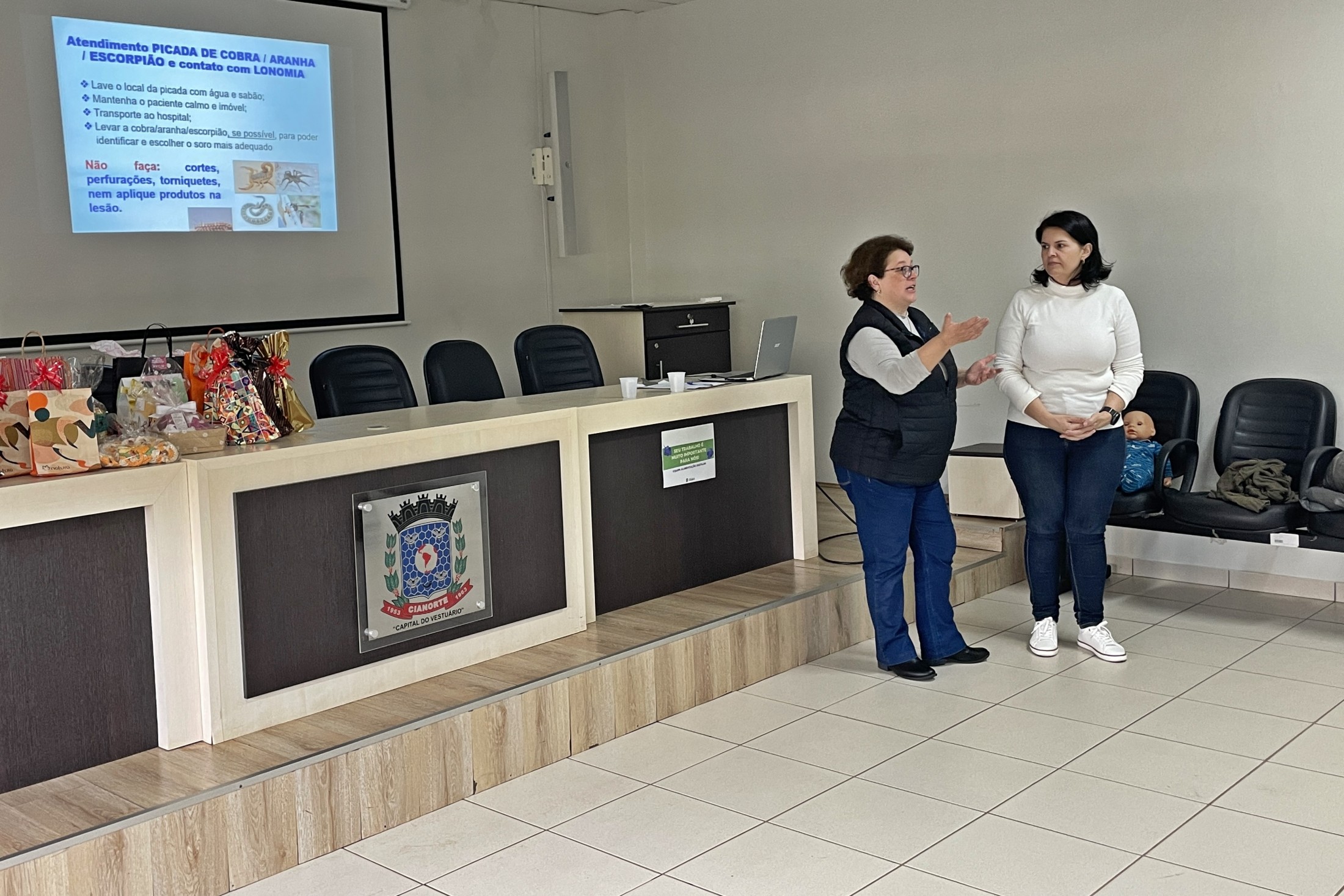 Durante o período de recesso escolar, os servidores da Secretaria Municipal de Educação recebem capacitação para aprimorar o trabalho no dia a dia. Nesta última segunda-feira (18), as merendeiras das Escolas Municipais tiveram uma qualificação sobre primeiros socorros e orientações gerais. A formação aconteceu no auditório do Paço Municipal e foi ministrada pela enfermeira Andreia Pizani Domingos.