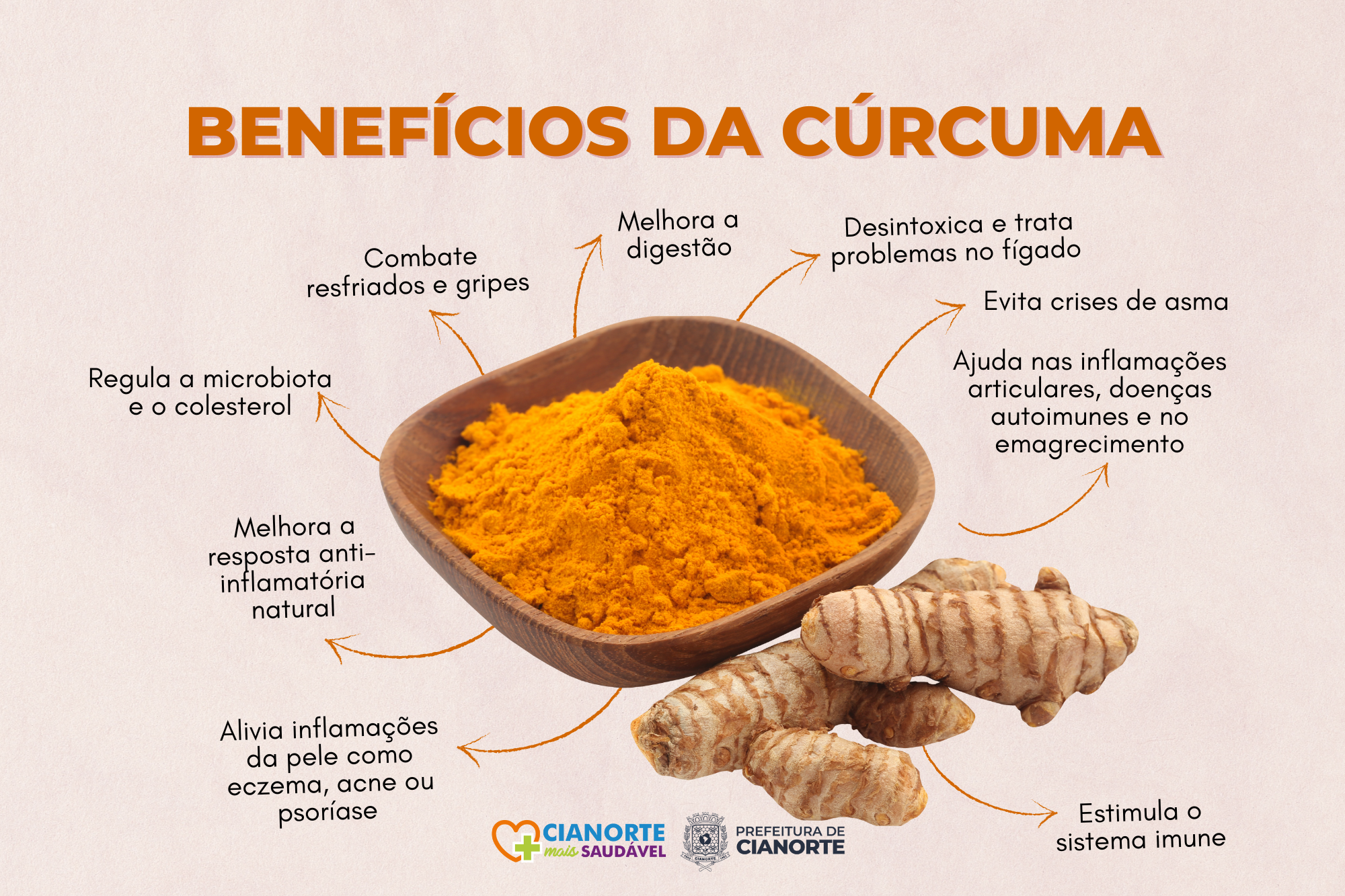 Para promover o acesso da população a orientações de combate ao sobrepeso, obesidade, intoxicações, complicações e doenças decorrentes da má alimentação, o Conselho Municipal de Segurança Alimentar e Nutricional promove o Projeto Cianorte Mais Saudável. Com publicação mensal, a iniciativa traz em julho os benefícios do açafrão-da-terra para a saúde. Conhecido como cúrcuma, normalmente é utilizado em forma de pó como tempero, condimento ou corante. Seu princípio ativo, a curcumina, possui potencial medicinal, tendo como principais propriedades a ação anti-inflamatória, antioxidante, antibacteriana e digestiva.