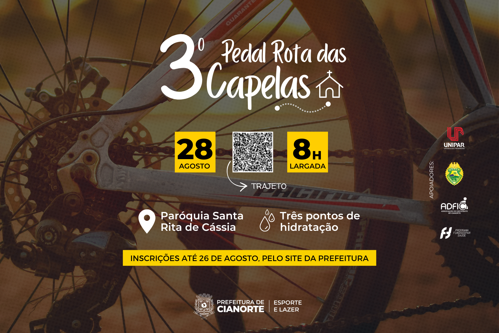 Amantes do Mountain Bike não competitivo já podem se inscrever para a 3ª edição do Pedal Rota das Capelas, que será realizada dia 28 de agosto. A iniciativa faz parte do Projeto Esporte de Aventura e Natureza, da Secretaria Municipal de Esporte e Lazer, em parceira com a Coordenadoria de Turismo, Diretran, secretarias municipais de Saúde e de Comunicação, Unipar, Fundação Hospitalar do Paraná (Fundhospar), Polícia Militar, ADFIC, Caminhos da Fé Cianortense e grupos de pedal de Cianorte.