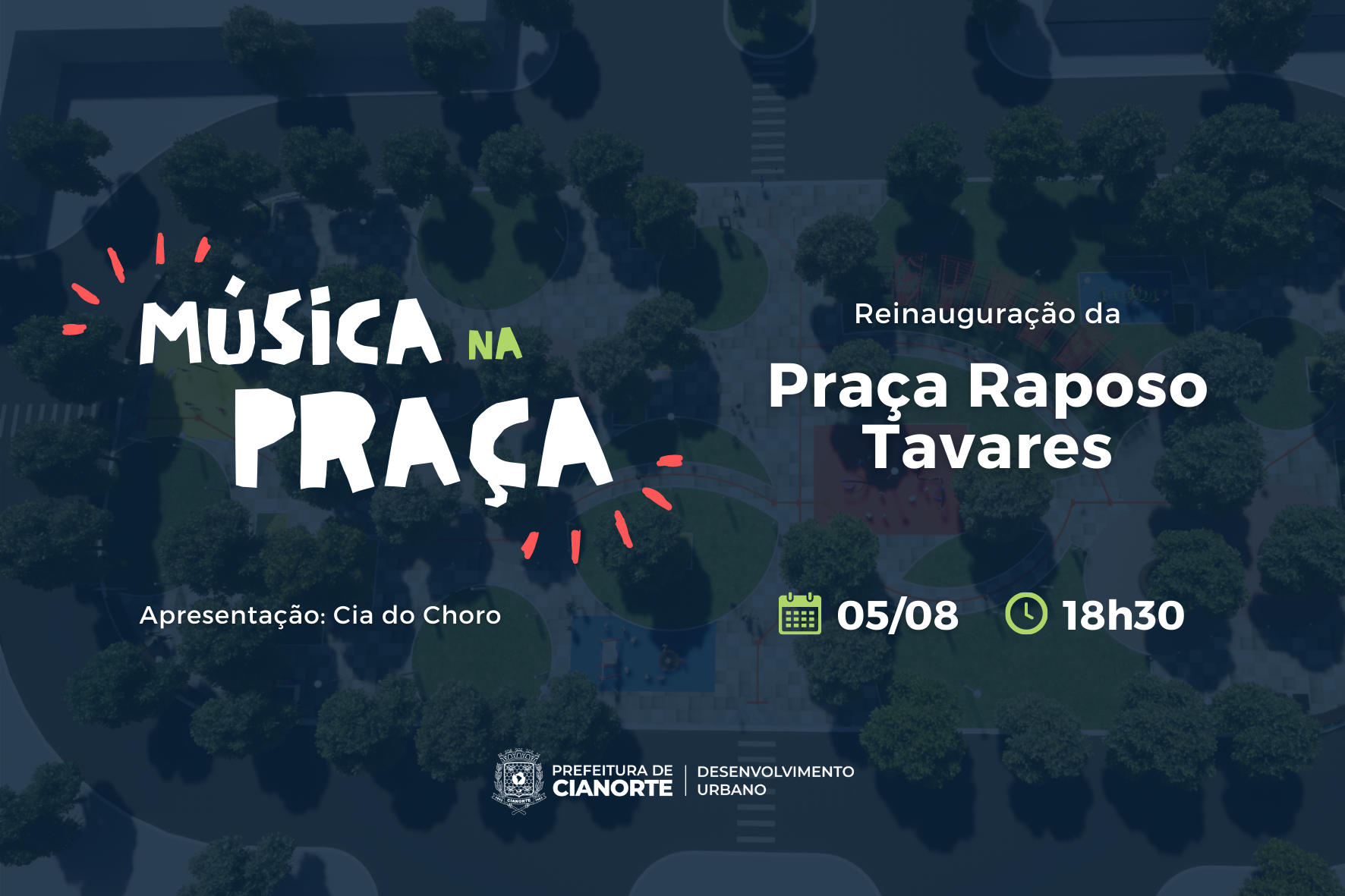 A Prefeitura de Cianorte, por meio da Secretaria Municipal de Desenvolvimento Urbano, inaugura, nesta sexta-feira (05), às 18h30, as obras de revitalização da Praça Raposo Tavares, no cruzamento das avenidas Brasil e Paraná. A solenidade contará com música ao vivo com o grupo Cia do Choro e a presença de autoridades municipais.