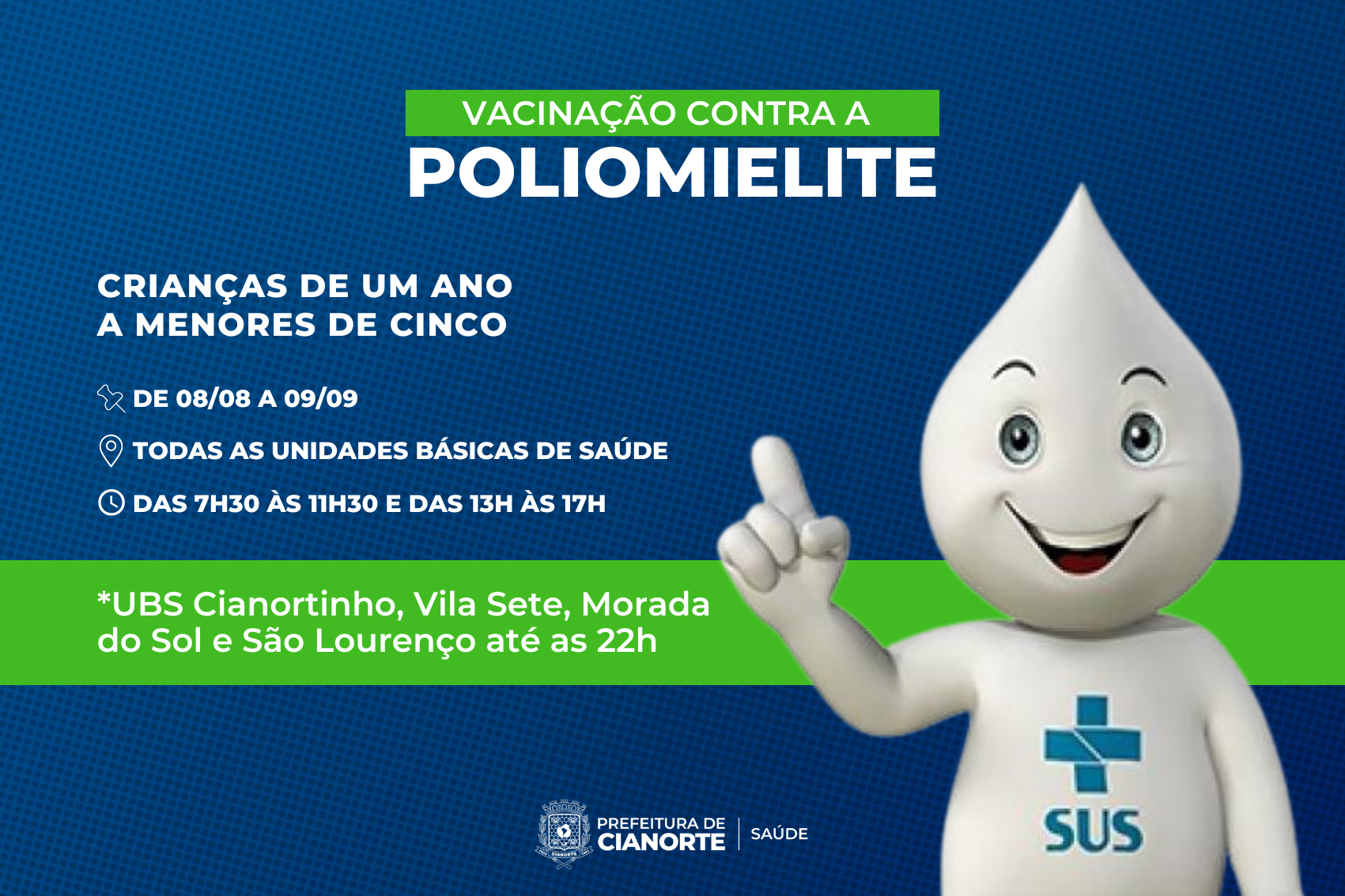 A Secretaria Municipal de Saúde inicia, nesta segunda-feira (08), a tradicional campanha de vacinação contra a poliomielite para crianças com idade de um ano a menores de cinco anos (4 anos, 11 meses e 29 dias). A imunização estará disponível em todas as Unidades Básicas de Saúde (UBSs), de segunda a sexta-feira, das 7h30 às 11h30 e das 13h às 17h, sendo que as do Cianortinho, Vila Sete, Morada do Sol e São Lourenço atendem até as 22h.