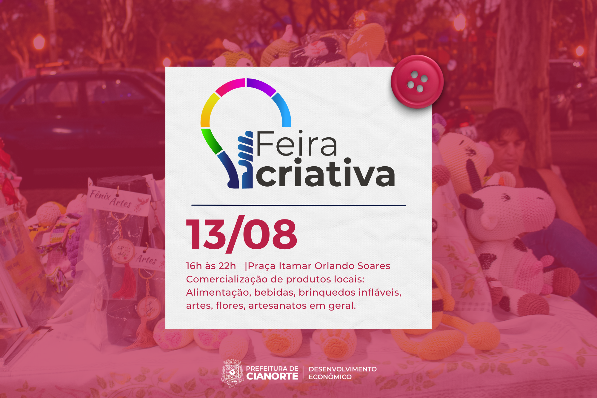 Os cianortenses e visitantes contam com uma opção de lazer, alimentação e compras neste sábado (13): a Feira Criativa, na Praça Itamar Orlando Soares (Feira do Produtor Rural), das 16h às 22h. A iniciativa, realizada todo segundo sábado do mês, reúne cerca de 40 empreendedores locais e oferece artesanato em geral; telas e peças decorativas; artigos em madeira; joalheria rústica e bijuterias; orquídeas, suculentas e outras plantas; gastronomia e perfumaria artesanal; produtos naturais; além de espaço para a diversão das crianças.