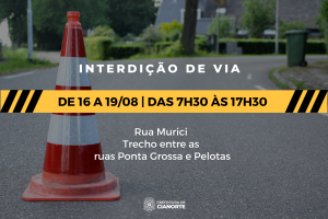 A partir desta terça-feira (16), até a sexta-feira (19), quem transita pela Zona 04 deve estar atento à interdição na Rua Murici, no trecho entre as ruas Ponta Grossa e Pelotas, das 7h30 às 17h30. O bloqueio se deve à realização de serviços de poda de árvores pela Secretaria Municipal de Meio Ambiente e Bem-Estar Animal.
