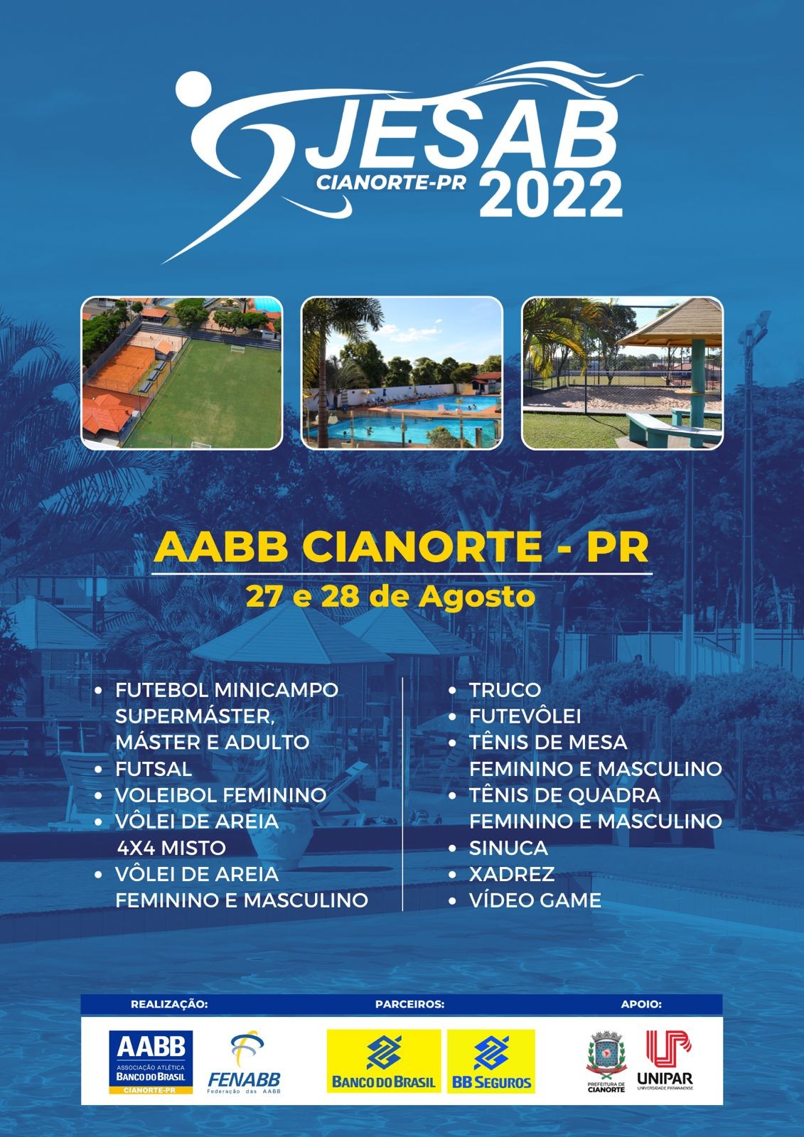 No próximo fim de semana, dias 27 e 28 de agosto, Cianorte será sede da Jornada Esportiva Estadual das AABBs – Jesab 2022. O evento terá a participação de 600 atletas, de 25 municípios, que disputarão em 17 modalidades: futebol minicampo supermáster, máster e adulto; futsal; voleibol feminino; vôlei de areia 4x4 misto; vôlei de areia feminino e masculino; truco; futevôlei; tênis de mesa feminino e masculino; tênis de quadra feminino e masculino; sinuca; xadrez e videogame.