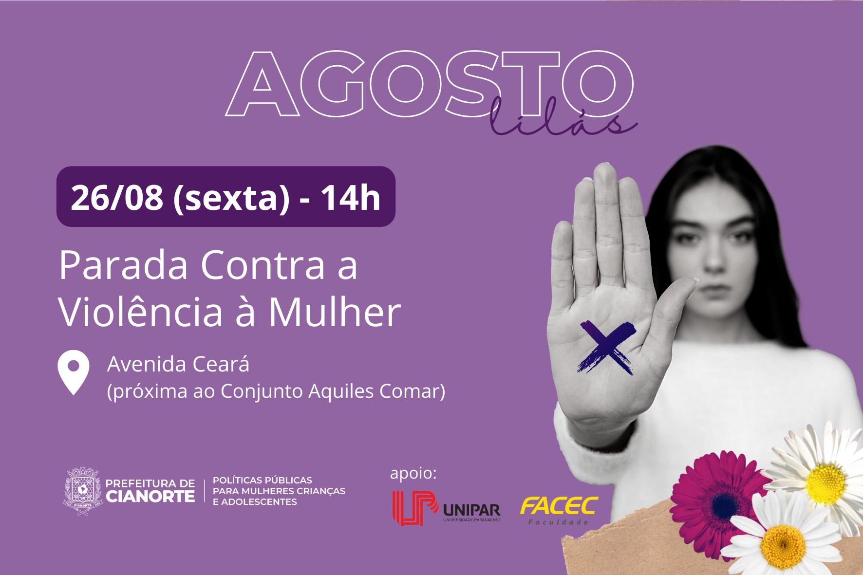Em decorrência do Agosto Lilás, mês alusivo à ações de enfrentamento à violência doméstica e familiar contra a mulher, e também à comemoração da criação da Lei Maria da Penha, a Secretaria Municipal de Políticas Públicas para Mulheres, Crianças e Adolescentes tem uma programação especial para chamar a atenção para a causa. Nesta sexta-feira (26), às 14h, acontece a Parada Contra a Violência à Mulher, na Avenida Ceará, próxima ao bairro Aquiles Comar, marcando o encerramento das atividades.
